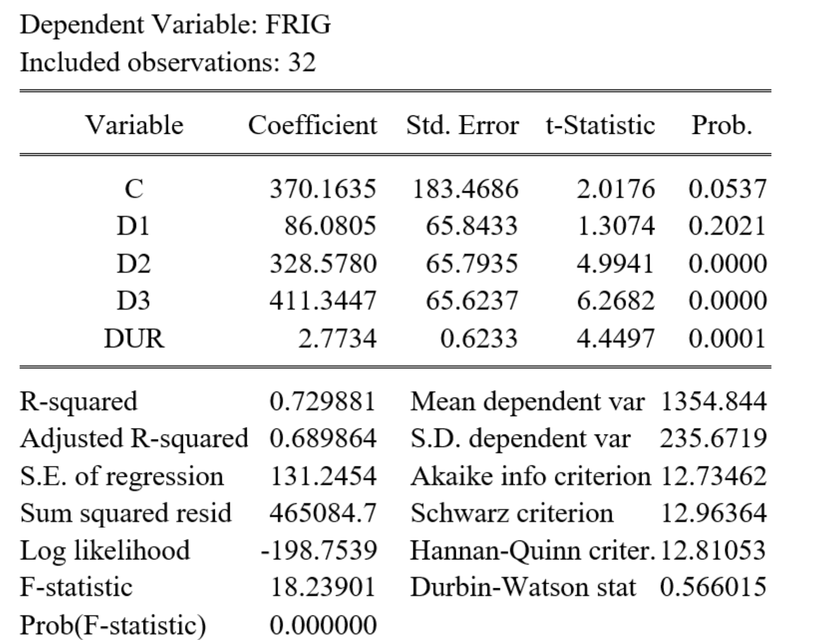 \[ \begin{align} \widehat{Frig}_{i}&=\hat{\alpha}_{1}+\hat{\alpha}_{2} D_{2}+\hat{\alpha}_{3} D_{3}+\hat{\alpha}_{4} D_{4}+\hat{\alpha}_{5} D u r_{i} \\ &= 456.2440+242.4975D_{2}+325.2642D_{3} -86.0805D_{4}+2.7734Dur_{i} \end{align} \]