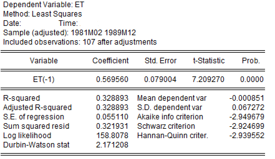 (4)根据回归方程报告,自协方差系数估计量为\(\tilde{\rho}=1-\frac{dw}{2}=1- \frac{0.84430}{2}=0.5778\)。