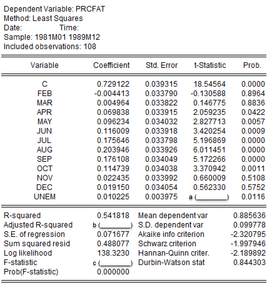 3.(9分)请分别计算上述EViews的回归结果(见 图 1 )中的空白项a、空白项b和空白项c。(要求:写出主要计算过程;结果保留4位小数。)