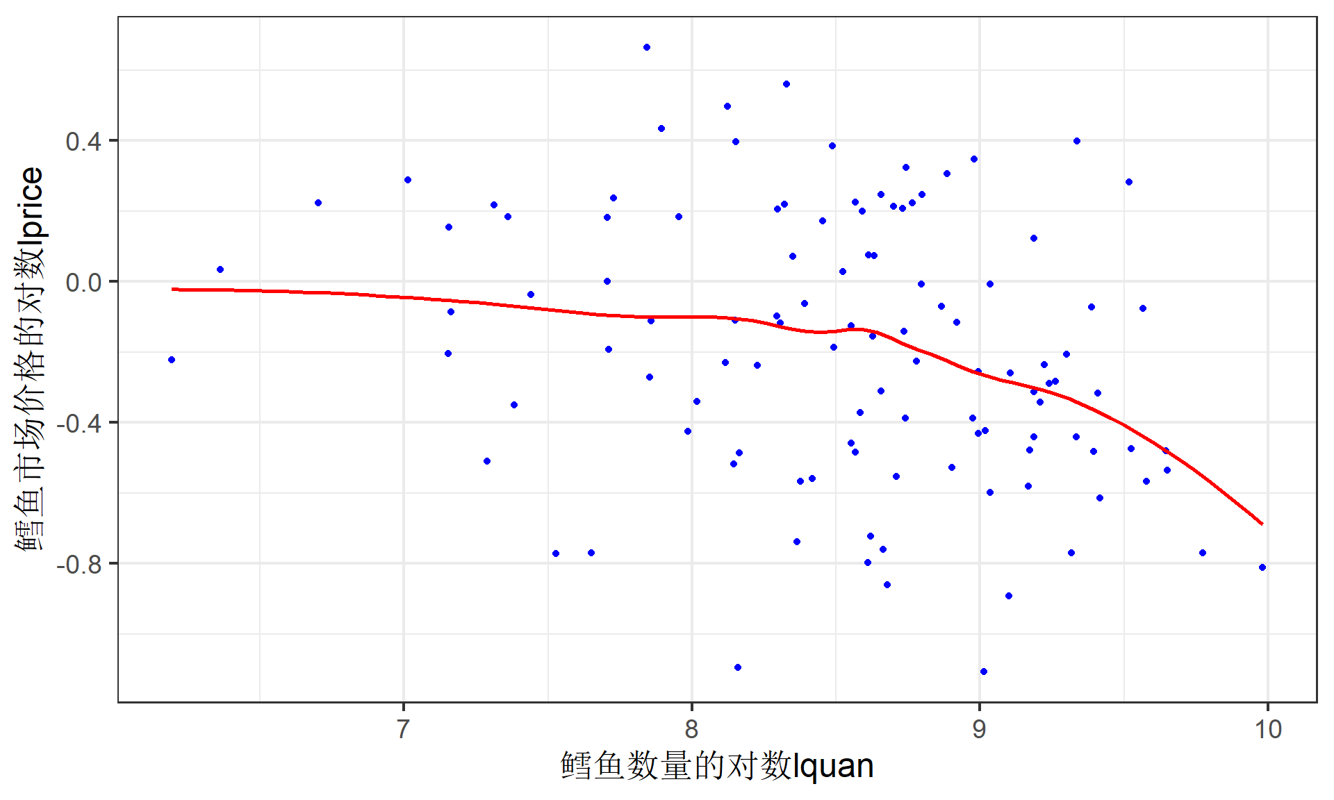 \[ \begin{align} lquan_t &= \alpha_0+\alpha_1lprice_t+\alpha_2mon_t+\alpha_3tue_t+\alpha_4wen_t+\alpha_5thu_t+u_{1t} &&\text{(需求函数)}\\ lquan_t &= \beta_0+\beta_1lprice_t+\beta_3stormy_t+u_{2t} &&\text{(供给函数)} \end{align} \]