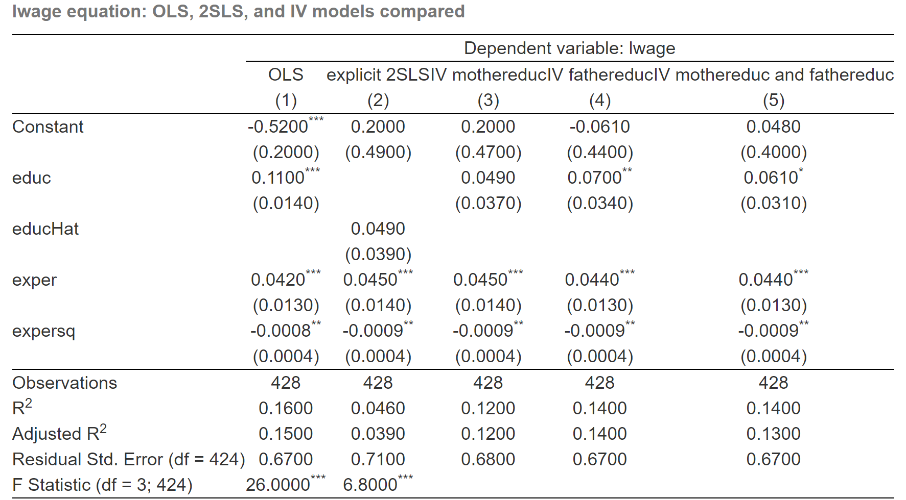 \[ \begin{cases} \begin{align} {educ} &= \hat{\gamma}_0 +\hat{\gamma}_1exper + \hat{\gamma}_2expersq + \hat{\theta}_1motheduc + \hat{\theta}_2fatheduc +v_i && \text{(stage 1)}\\ lwage & = \hat{\eta}_1 +\hat{\eta}_2\widehat{educ} + \hat{\eta}_3exper +\hat{\eta}_4expersq + e_i && \text{(stage 2)} \end{align} \end{cases} \]