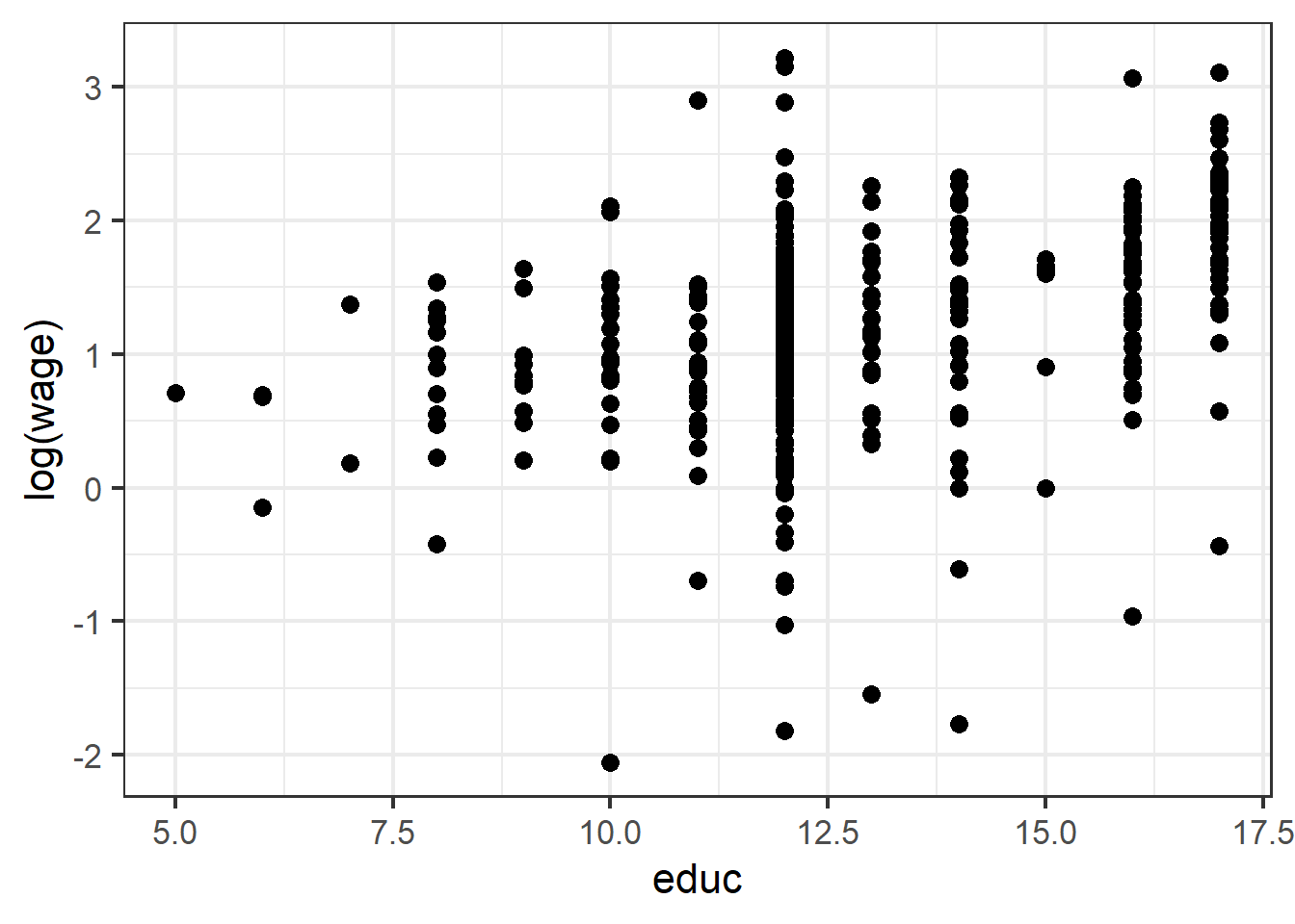 \[ \begin{aligned} lwage & = \hat{\alpha}_0 +\hat{\alpha}_1 {educ} + \hat{\beta}_1 exper +\hat{\beta}_2 expersq + u_i && \text{(origin model)} \end{aligned} \]