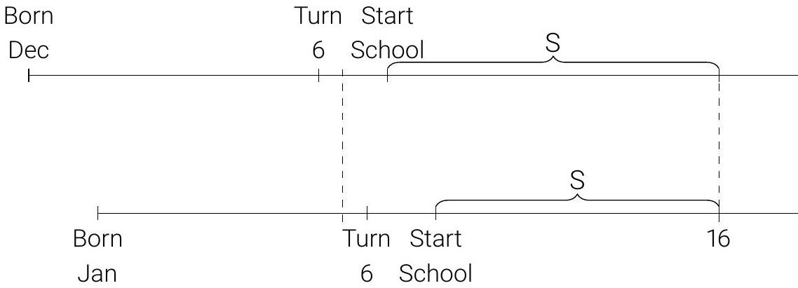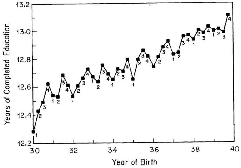 --- count: false class: center, middle, duke-orange,hide_logo name: session-weak-iv # Session <br>(Handeling Weak Instruments) [Lots of Instrumental Variables](#lots-of-iv) [Weak Instruments](#weak-instruments) --- layout: false class: center, middle, duke-softblue,hide_logo name: lots-of-iv ## Lots of Instrumental Variables --- layout: true <div class="my-header-h2"></div> <div class="watermark1"></div> <div class="watermark2"></div> <div class="watermark3"></div> <div class="my-footer"><span>huhuaping@ <a href="#chapter17"> Session: Weak Instumental Variables |</a>               <a href="#definition"> Lots of Instrumental Variables </a> </span></div> --- ### Introduction > "In instrumental variables regression, the instruments are called weak if their correlation with the endogenous regressors, conditional on any controls, is close to zero." <!-- > <footer>--- Andrews,StockandSun (2018)</footer> --> > --- Andrews,StockandSun (2018) --- ### Weak instruments - Whereas exclusion restriction is not testable, the non-zero first stage - Weak instruments can happen if the two variables are independent or the sample is small - If you have a weak instrument, then the bias of 2SLS is centered on the bias of OLS and the cure ends up being worse than the disease - This brought into sharp focus with Angrist and Krueger (1991) quarter of birth study and some papers that followed --- ### March 2022 Interview with Angrist Before we dive into the paper, though, let's listen to Angrist discuss the history https://youtu.be/ApNtXe-JDfA?t=2348 Somewhat inspiring to hear how Angrist reframed the weak instrument problem which his paper with Krueger brought into crisp focus --- ### Angrist and Krueger (1991) - In practice, it is often difficult to find convincing instruments usually because potential instruments don't satisfy the exclusion restriction - But in an early paper in the causal inference movement, Angrist and Krueger (1991) wrote a very interesting and influential study instrumental variable - They were interested in schooling's effect on earnings and instrumented for it with which quarter of the year you were born - Remember "strangeness principle" > - why would birth quarter cause earnings in the reduced form (First stage of TSLS)? --- ### Compulsory schooling - In the US, you could drop out of school once you turned 16 - "School districts typically require a student to have turned age six by January 1 of the year in which he or she enters school" (Angrist and Krueger 1991, p. 980) - Children have different ages when they start school, though, and this creates different lengths of schooling at the time they turn 16 (potential drop out age): <!--  --> <img src="https://cdn.mathpix.com/cropped/2025_04_25_68eb43294085102bb2c5g-048.jpg?height=411&width=1138&top_left_y=174&top_left_x=122" width="65%" style="display: block; margin: auto;" /> If you're born in the fourth quarter, you hit 16 with more schooling than those born in the first quarter --- ### Visuals - You need good data visualization for IV partly because of the scrutiny around the design - The two pieces you should be ready to build pictures for are the first stage and the reduced form - Angrist and Krueger (1991) provide simple, classic and compelling pictures of both --- ### Visuals: First Stage of TSLS Men born earlier in the year have lower schooling. This indicates that there is a first stage. Notice all the age cohorts 30s and 40s at the bottom. But then notice how it attenuates over time ... <!--  --> .pull-left[ <img src="https://cdn.mathpix.com/cropped/2025_04_25_68eb43294085102bb2c5g-050.jpg?height=549&width=787&top_left_y=323&top_left_x=220" style="display: block; margin: auto;" /> ] .pull-right[ <img src="https://cdn.mathpix.com/cropped/2025_04_24_8b8d91658673077f1454g-06.jpg?height=742&width=1060&top_left_y=1083&top_left_x=139" style="display: block; margin: auto;" /> ] --- ### Visuals: Fisrt Stage of TSLS Do differences in schooling due to different quarter of birth translate into different earnings? <!-- {style="width:30%;"} --> <img src="https://cdn.mathpix.com/cropped/2025_04_25_68eb43294085102bb2c5g-051.jpg?height=550&width=779&top_left_y=302&top_left_x=245" width="65%" style="display: block; margin: auto;" /> --- exclude: true ### Two Stage Least Squares model (Setup) - The causal model is $$ `\begin{aligned} Y_{i} &= X \pi+\delta S_{i}+\varepsilon \\ \end{aligned}` $$ - The first stage regression is: $$ `\begin{aligned} S_{i} &= X \pi_{10}+\pi_{11} Z_{i}+\eta_{1 i} \\ \end{aligned}` $$ - The reduced form regression is: $$ `\begin{aligned} Y_{i} &= X \pi_{20}+\pi_{21} Z_{i}+\eta_{2 i} \\ \end{aligned}` $$ - The sample analog of the Wald estimator that adjusts for covariates: `\(\frac{\pi_{21}}{\pi_{11}}\)` --- ### Two Stage Least Squares model (Instruments) - Angrist and Krueger (1991) instrument for schooling using three quarter of birth dummies: a dummies for 1st, 2nd and 3rd `Qob` - Their initial first-stage regression is: $$ `\begin{aligned} S_{i} &= X \pi_{10}+Z_{1 i} \pi_{11}+Z_{2 i} \pi_{12}+Z_{3 i} \pi_{13}+\eta_{1} \\ \end{aligned}` $$ - The second stage is the same as before (including all controls `\(X\)` ), but the fitted values are from the new first stage $$ `\begin{aligned} Y_{i} &= X \pi+\delta \widehat{S}_{i}+\epsilon \\ \end{aligned}` $$ --- ### Data and variables summary (1/3) The data set contains men from the official 1970/1980 Census, 5 percent Public Use Sample. Sample for men born in: - Born in 1920-1929 (1920s, age cohort 50-59): `\(n = 247,199\)` - Born in 1930-1939 (1930s, age cohort 40-49): `\(n = 329,509\)` - Born in 1940-1949 (1940s, age cohort 30-39): `\(n = 486,926\)` --- ### Data and variables summary (2/3) Model's intercept: - All models include an intercept term due to the dummy variables (not shown in the table). Dependent variables: - `Ln(W)`: Log of weekly earnings (mainly used) - An MA(+2, -2) trend term was subtracted from each dependent variable. - `Ln(Wk