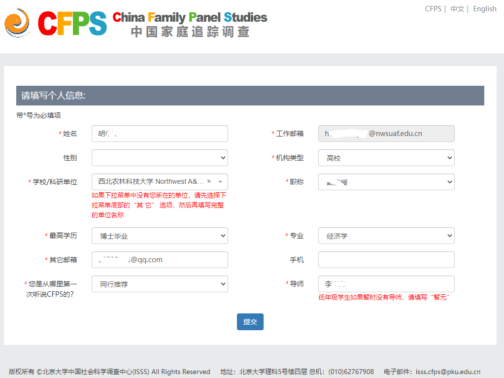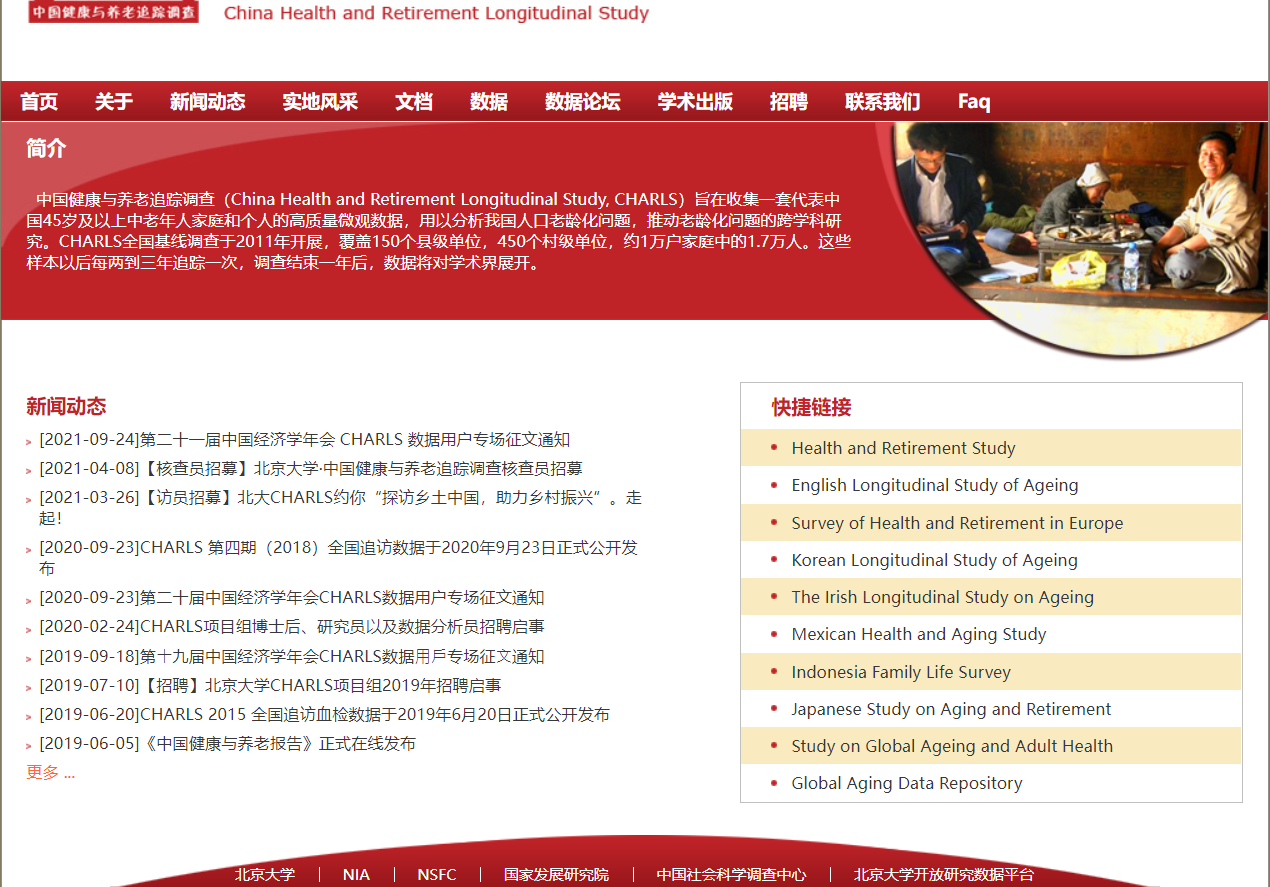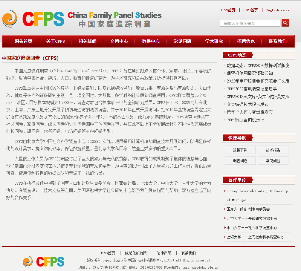 北京大学中国社会科学调查中心(ISSS)。主要的中国家庭追踪调查(CFPS)、中国健康与养老追踪调查(CHARLS)