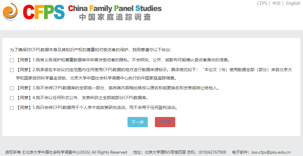 在CFPS 用户注册申请数据的用户协议中已明确指出,用户不能将CFPS 微观数据直接放置于包括期刊网站在内的第三方平台上,无论是原始完整数据,还是整理提取后的数据(如提取部分变量、进行清理后的子样本数据集等)。