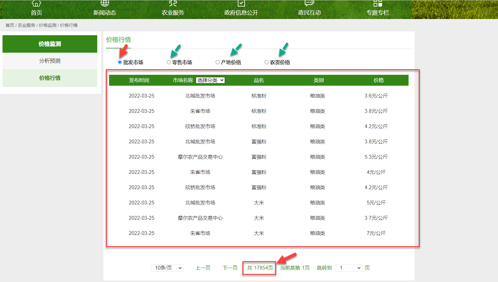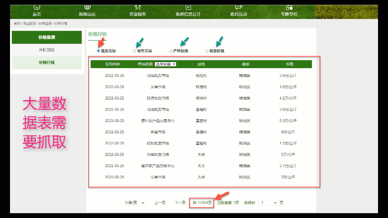 网站结构化页面(信息比较规范,展示格式比较统一):例如京东商城、全国农产品批发市场价格网、海关统计数据查询平台等。