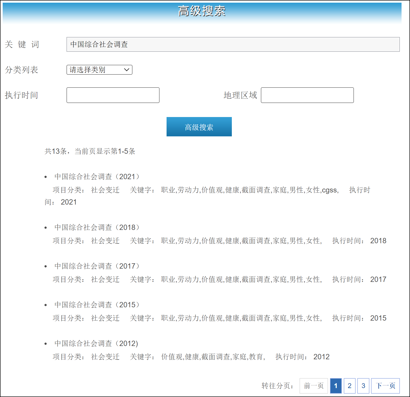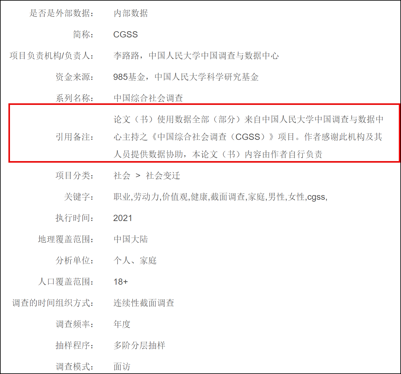 中国人民大学中国调查与数据中心(NSRC)。主要的数据源有中国综合社会调查(CGSS)、中国教育追踪调查(CEPS)、中国宗教调查(CRS)、中国老年社会追踪调查(CLASS)、中国国家调查数据库(CNSDA)