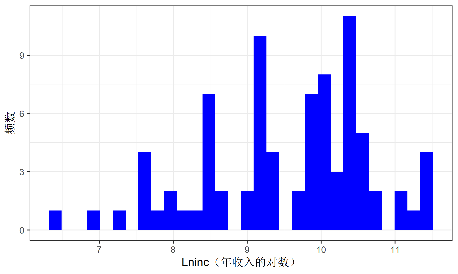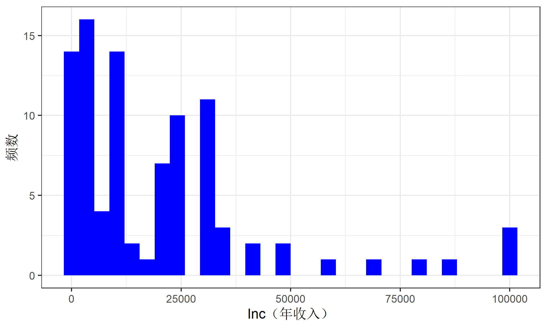 数据的转换:对于右偏分布较严重的变量,即右侧异常值较多,自然对数(ln())可以使其更加对称。比如,年收入及其对数的分布。