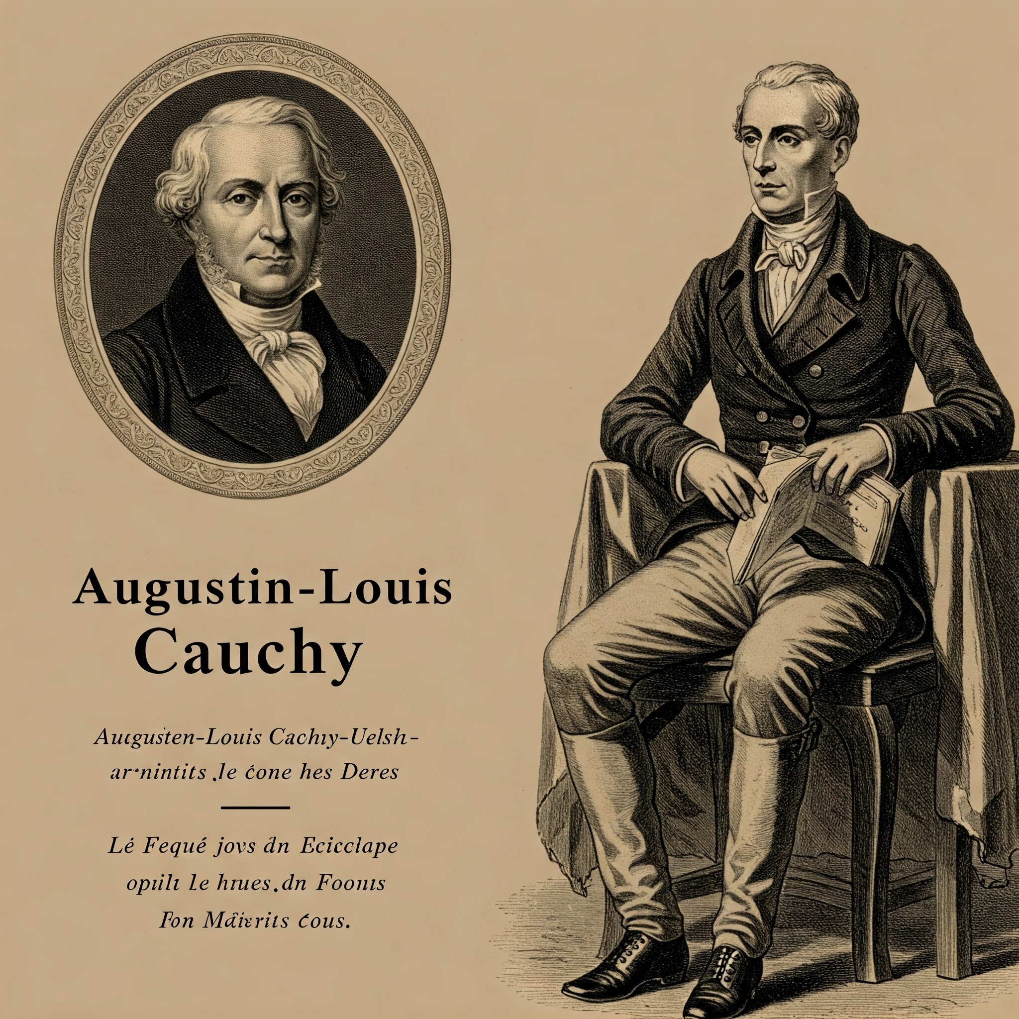 中文提示词:“创作一张具有典雅性和历史厚重感的图片,图片布局为左右结构。左侧描绘著名统计学家奥古斯丁-路易·柯西的肖像。肖像下方第一行居中书写英文全名:Augustin-Louis Cauchy;第二行居中书写生卒年份:(1789-1857)。右侧描绘柯西最著名的作品的出版物封面。封面下方居中书写名言:“概率论是数学的一个分支,它研究随机现象的数量规律。”。图片尺寸:1600x900像素。图片格式:PNG。”