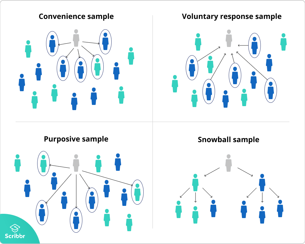 非概率抽样:抽取样本时不是依据随机原则,而是根据研究目的对数据的要求,采用某种方式从总体中抽出部分单位对其实施调查。包括:方便抽样、判断抽样、自愿样本、滚雪球抽样、配额抽样。