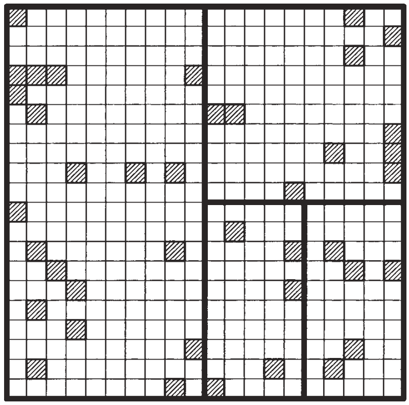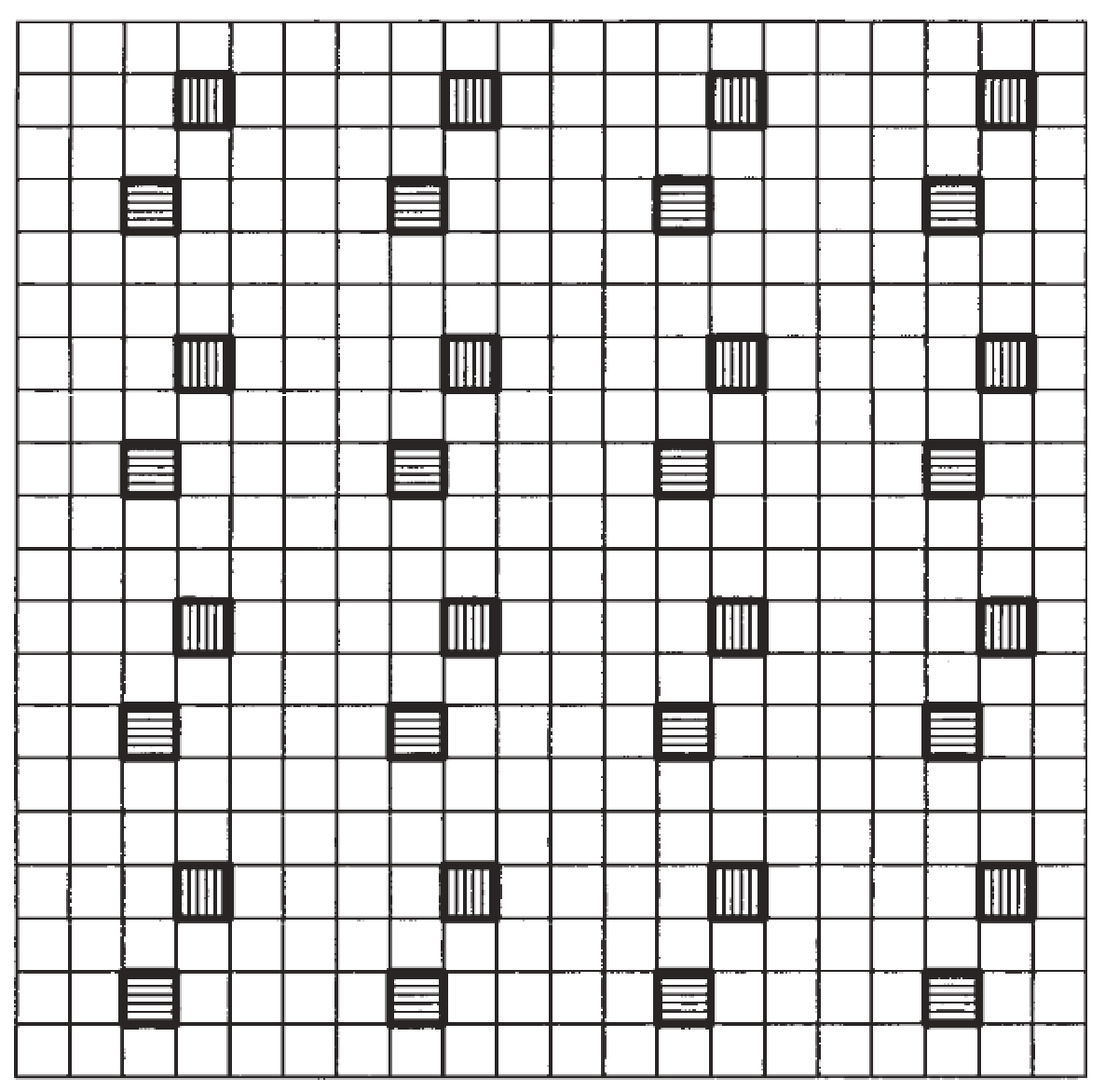样本中的主要抽样单元(PSU)的数量 \(n=2\) :每个5*5中型方框的都抽中了2个着色小格。