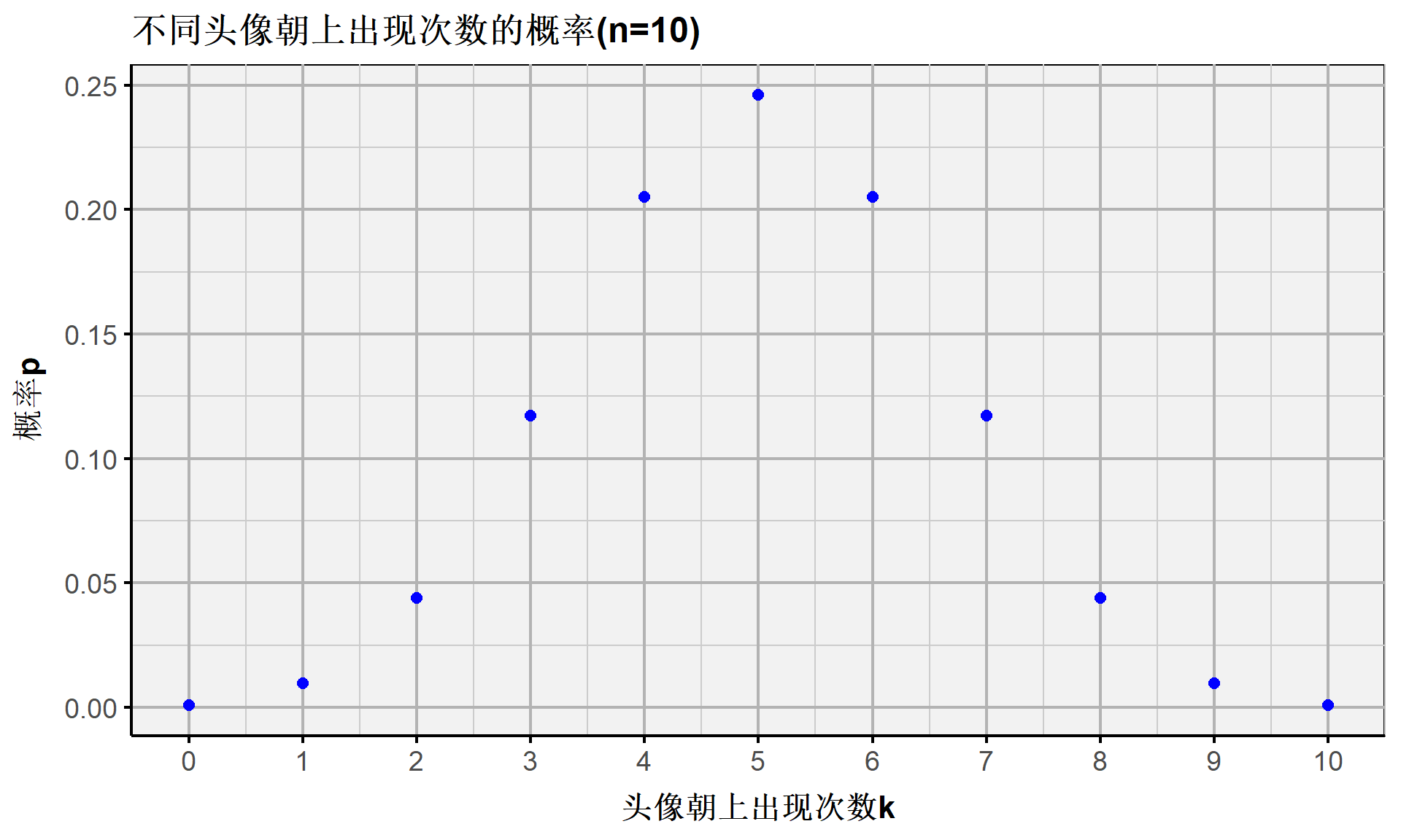 例如,连续抛10次硬币且其中5次为头像朝上的伯努利概率记为 \(P(k=5\vert n = 10, p = 0.5)\) ,具体计算R函数及其结果为: