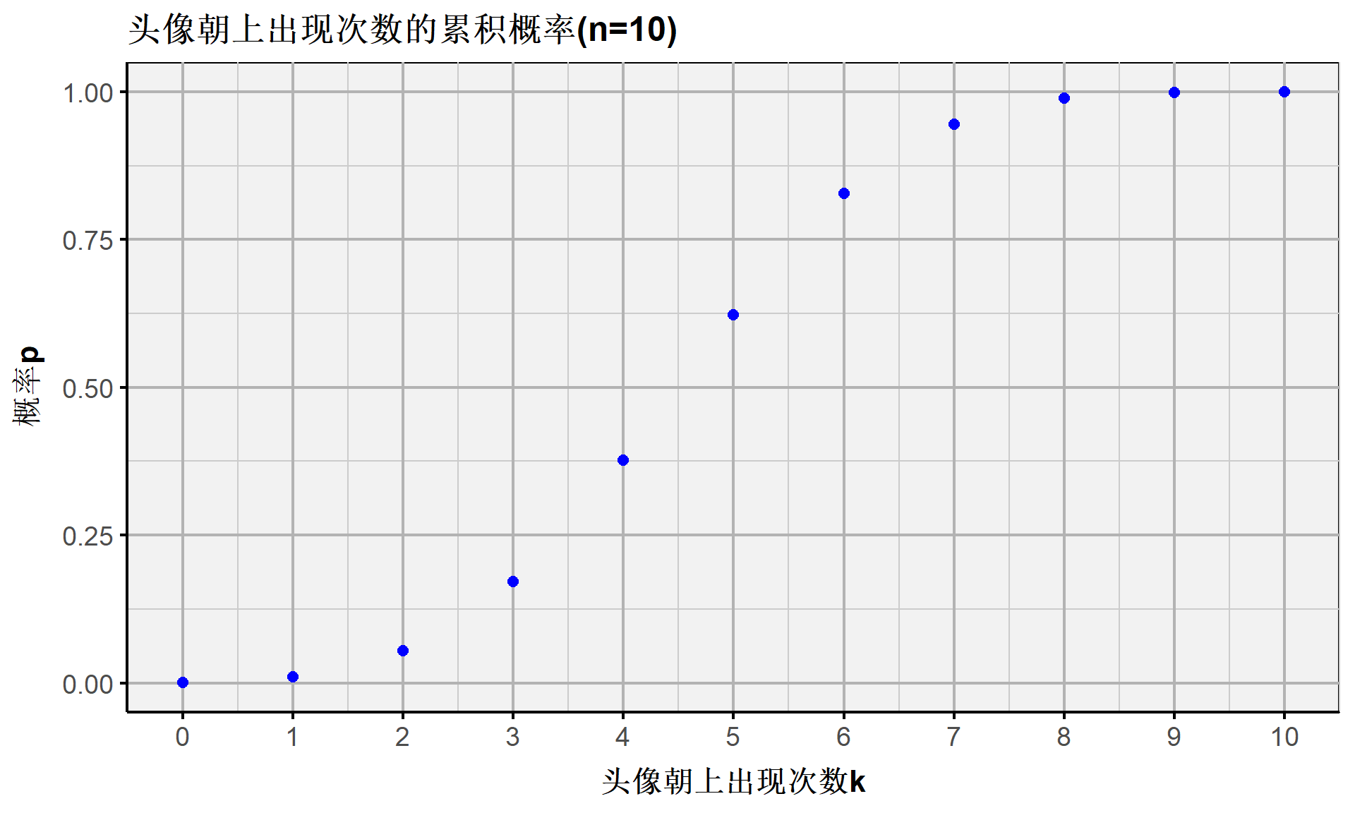 又例如,连续抛10次硬币且其中头像朝上次数在 \(4 \sim 7\) 次之间的伯努利概率记为 \(P(4 \leq k \leq 7) = P(k \leq 7) - P(k\leq3 )\) ,具体计算R函数及其结果为: