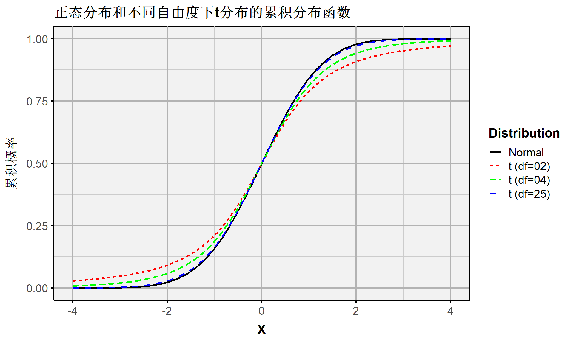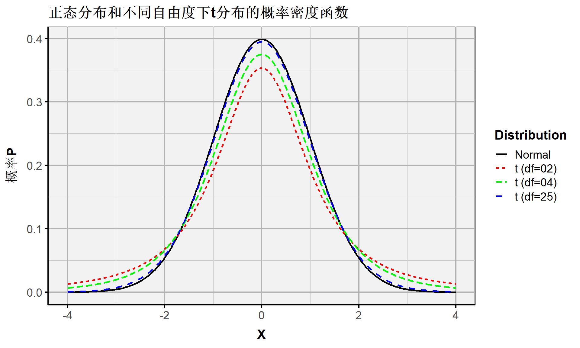 如果随机变量 \(\bar{y}\) 的总体方差 \({Var}(\bar{y})\) 未知,则无法使用上述正态分布 \(\mathcal{N}\) 或者标准正态 \(\mathcal{Z}\) 分布,进行有关置信区间的样本推断。幸运的是,我们可以构造出如下服从t分布的随机变量: