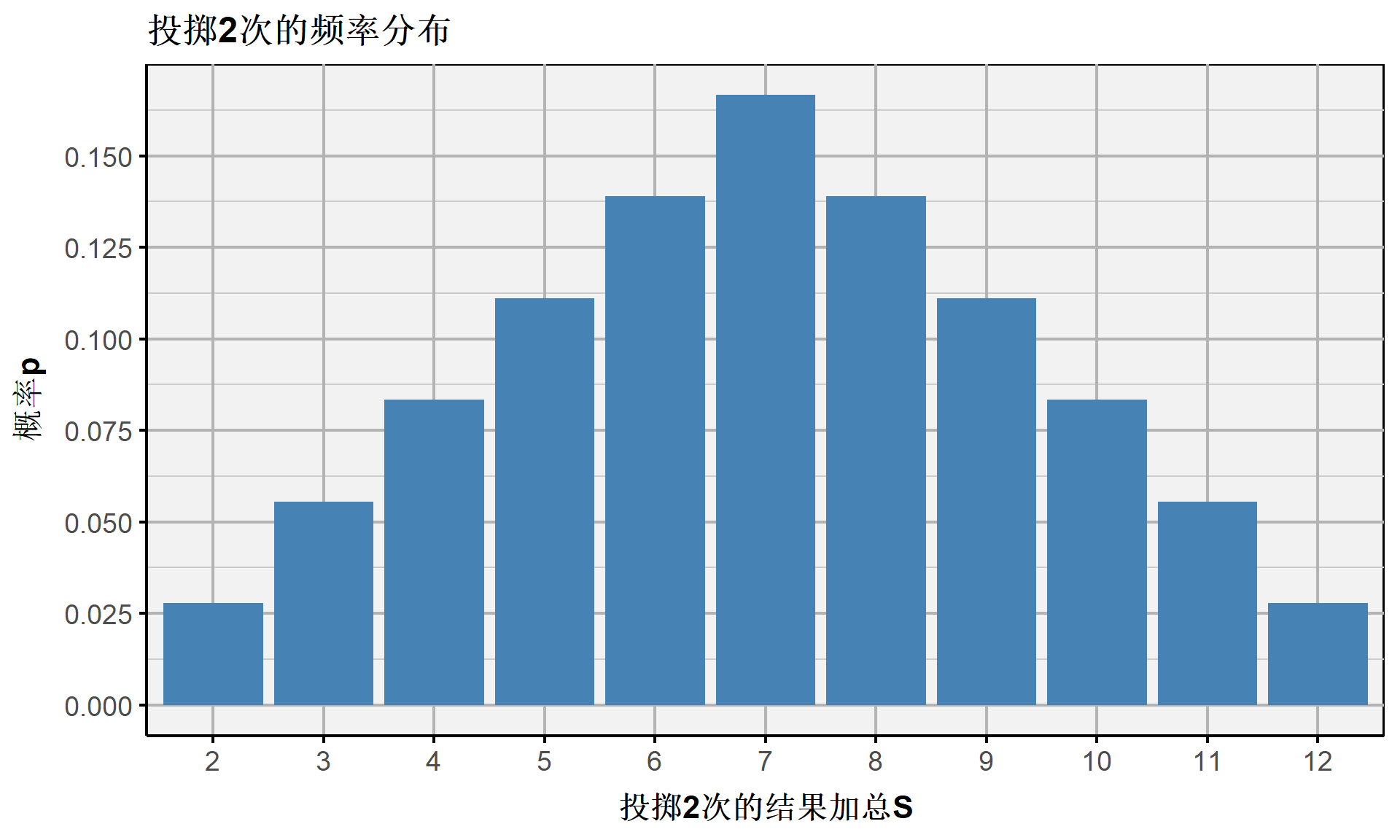 六点骰子的可能结果为 \(\{1,2,3,4,5,6\}\) ,如果随机投掷2次,可以得到2次结果的数值加总: