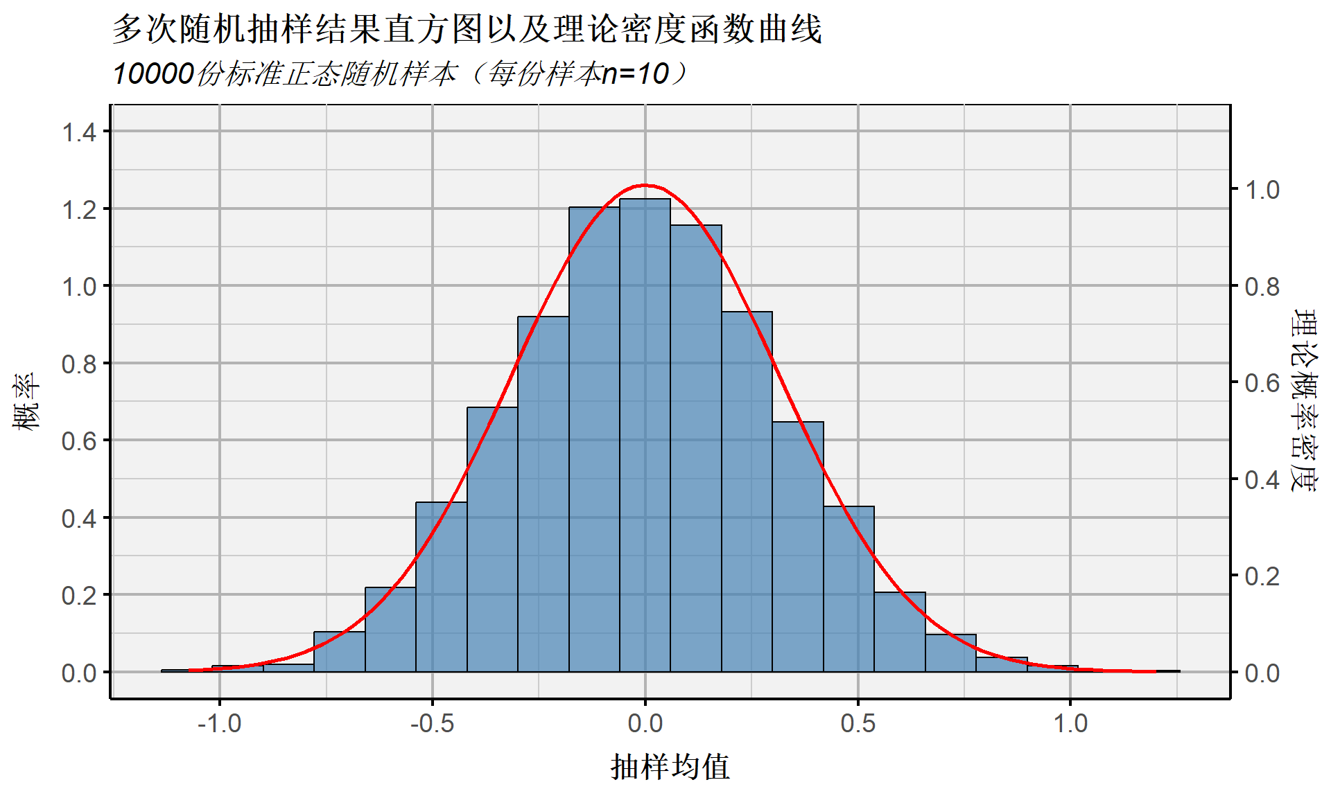 如果样本容量 \(n\) 很小,随机变量 \(\bar{y}\) 的可能分布会是多种多样的。有限总体中心极限定理表明,随着样本容量 \(n\) 的不断增大,随机变量 \(\bar{y}\) 的分布会越来越稳定,并趋向于正态分布(normal distribution),从而有: