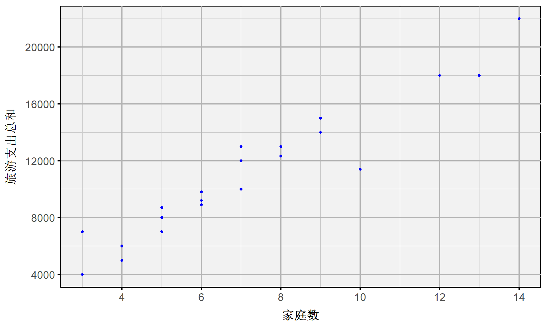 初步分析抽样的各群组我们可以发现,主要抽样单元(PSU)的变量总值 \(y_i\) (各群组内全部家庭的旅游支出总和)与主要抽样单元(PSU)的单位规模 \(M_i\) (各群组的家庭数)存在高度正相关关系。