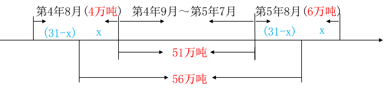 根据水平法,只需要连续一个自然年(12个月)达到年计划产量,就算完成任务产量56万吨 \(^\ast\) 。容易计算得到,12个月滚动累加的结果如下表。