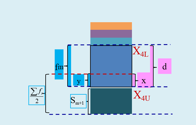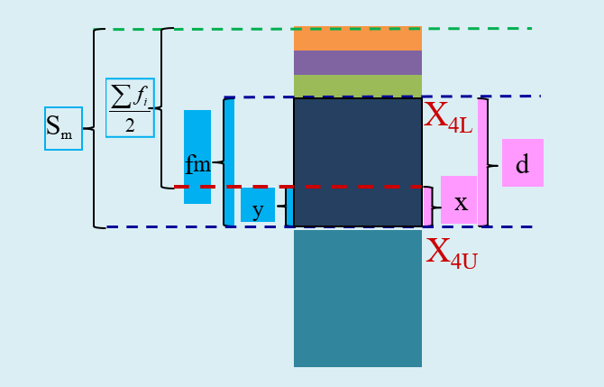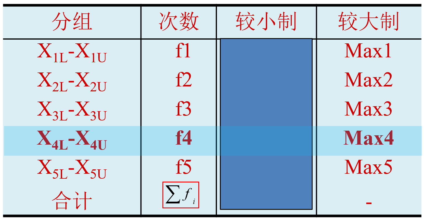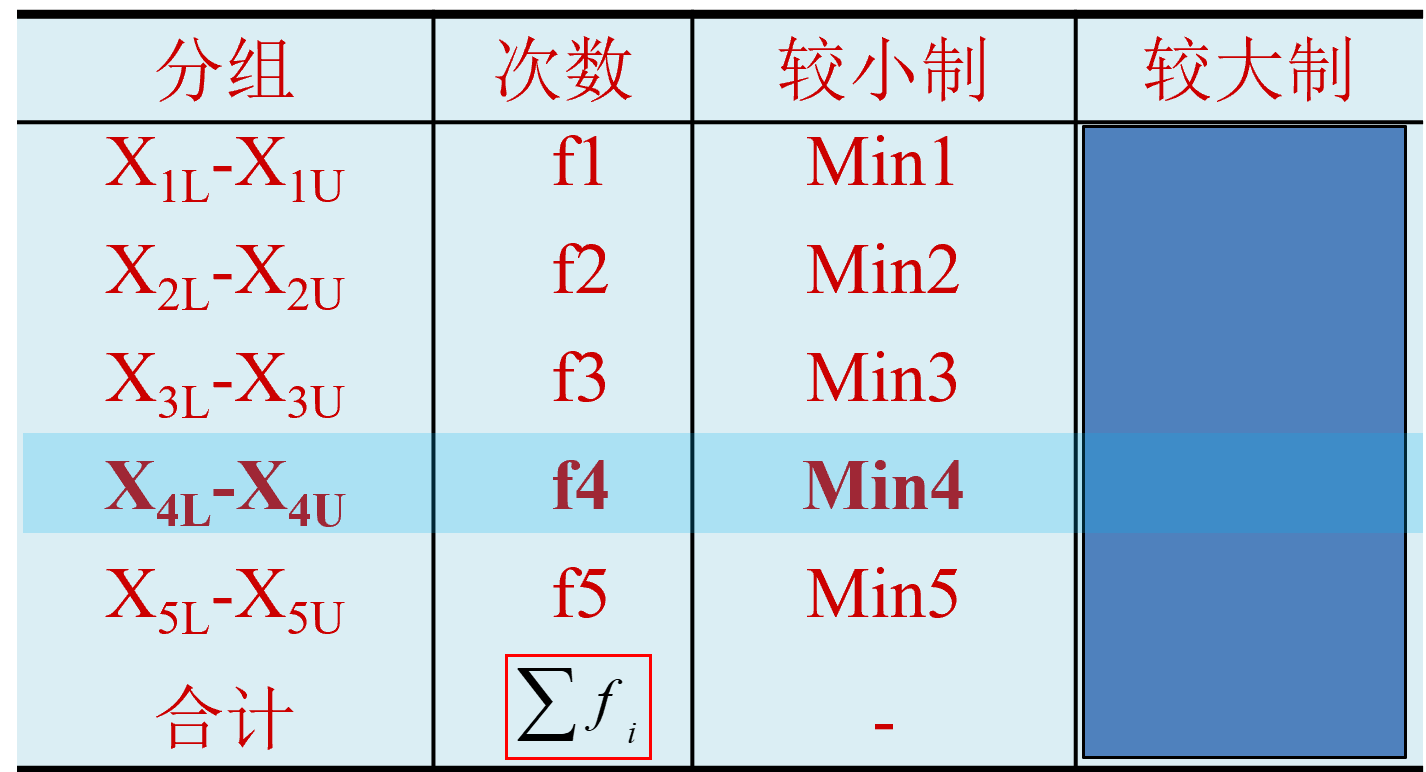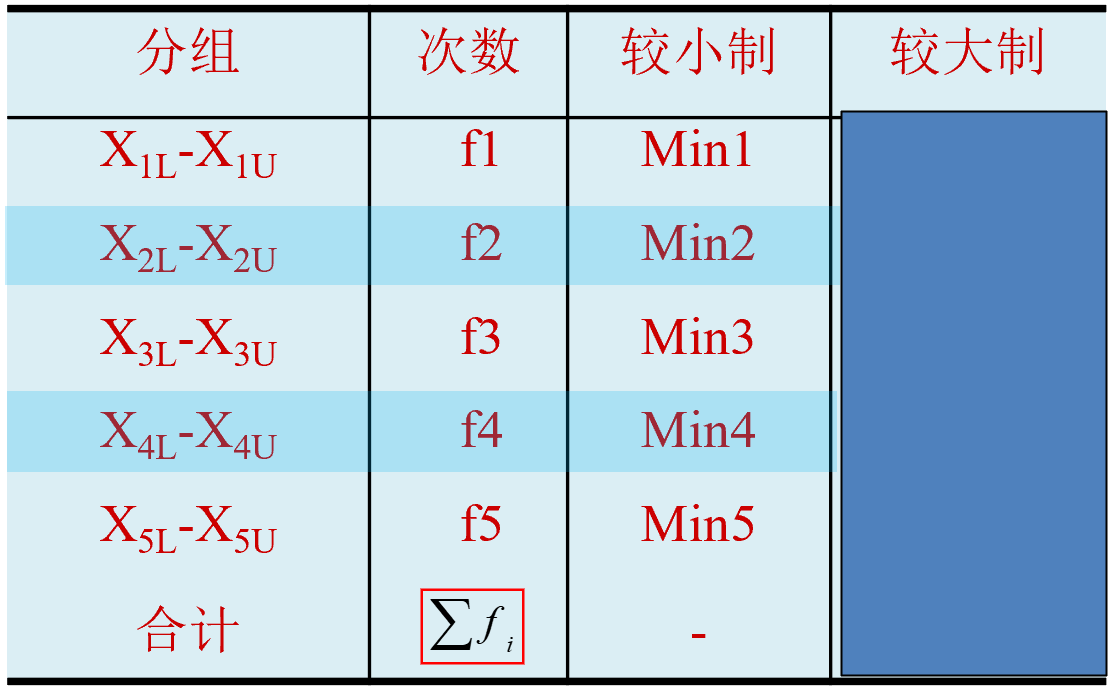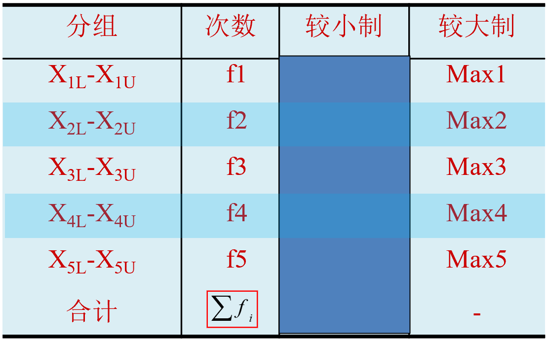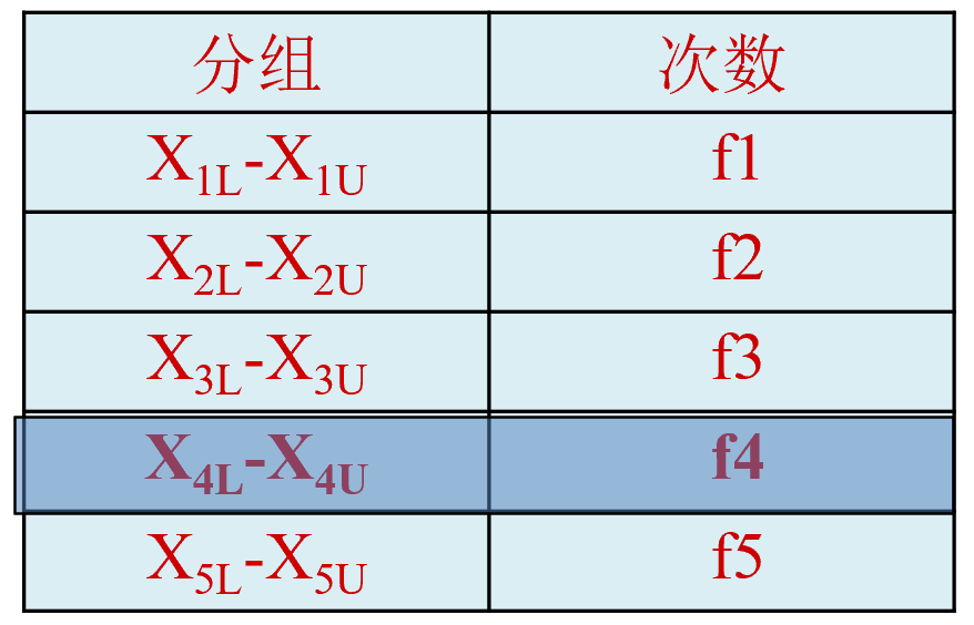 \(n\) 表示总次数; \(f_i\) 表示各组次数; \(M_i\) 表示各组组中值; \(S_X\) 表示样本标准差 \(S_X =\sqrt{\frac{\sum_1^n{(X_i- \bar{X})^2}}{n-1}}\) 。