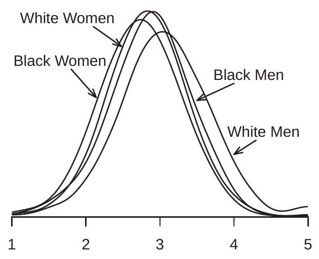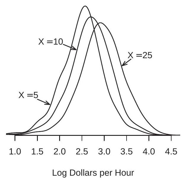 Consider further splitting the male and female subpopulations by race, dividing the population into whites, Blacks, and other races. We display the log wage density functions of four of these groups in Figure \(2.2\) (b). Again we see that the primary difference between the four density functions is their central tendency.