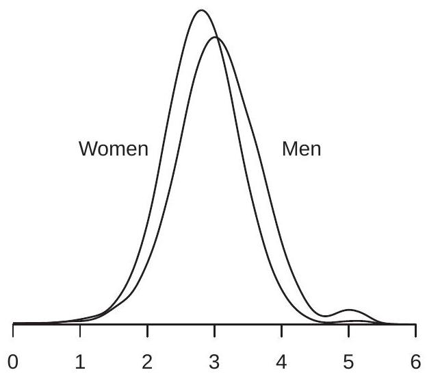 We saw in Figure 2.1(b) the density of log wages. Is this distribution the same for all workers, or does the wage distribution vary across subpopulations? To answer this question, we can compare wage distributions for different groups - for example, men and women. To investigate, we plot in Figure \(2.2\) (a) the densities of log wages for U.S. men and women. We can see that the two wage densities take similar shapes but the density for men is somewhat shifted to the right.
