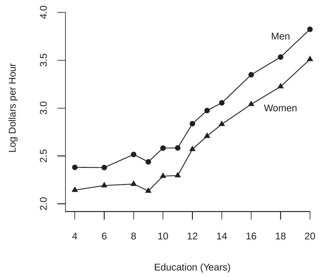 We display in Figure \(2.3\) the conditional expectation of \(\log\) (wage) as a function of education, separately for (white) men and women. The plot is quite revealing. We see that the conditional expectation is increasing in years of education, but at a different rate for schooling levels above and below nine years. Another striking feature of Figure \(2.3\) is that the gap between men and women is roughly constant for all education levels. As the variables are measured in logs this implies a constant average percentage gap between men and women regardless of educational attainment.