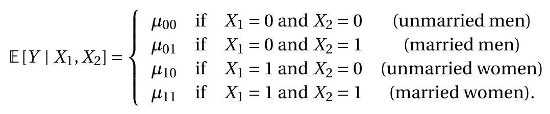Exercise 2.9 Suppose you have two regressors: \(X_{1}\) is binary (takes values 0 and 1) and \(X_{2}\) is categorical with 3 categories \((A, B, C)\). Write \(\mathbb{E}\left[Y \mid X_{1}, X_{2}\right]\) as a linear regression.
