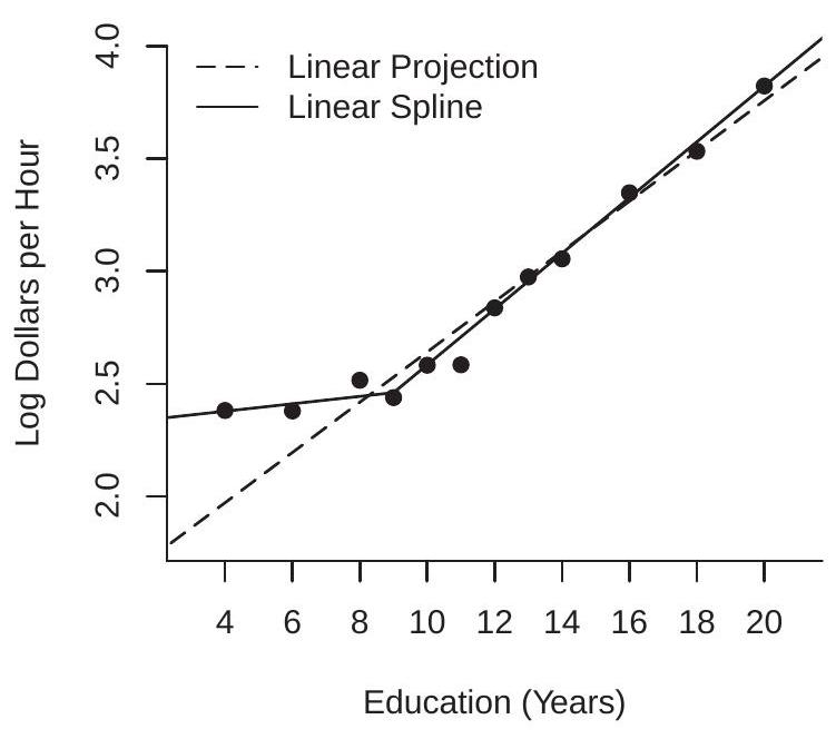 The conditional expectation of \(\log (\) wage \()\) given gender, race, and education is a single number for each category. For example