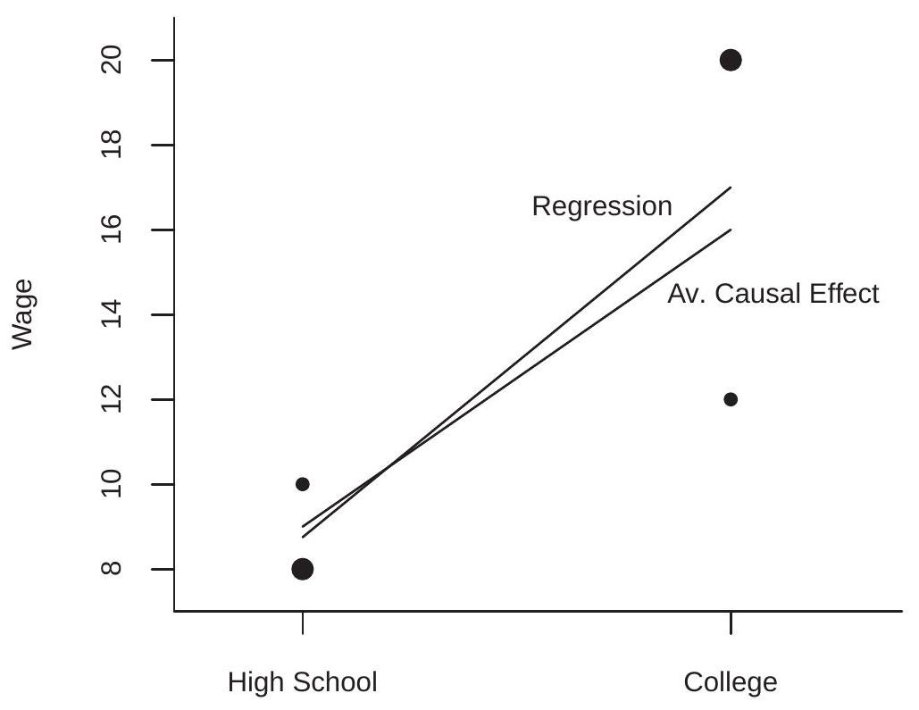 \[ \begin{gathered} \mathbb{E}[\log (\text { wage }) \mid \text { gender }=\text { man }]=3.05 \\ \mathbb{E}[\log (\text { wage }) \mid \text { gender }=\text { woman }]=2.81 . \end{gathered} \]