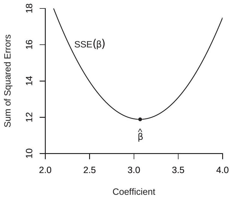 This is a quadratic function of \(\beta\). The sum of squared error function is displayed in Figure \(3.1\) (b) over the range \([2,4]\). The coefficient \(\beta\) ranges along the \(x\)-axis. The sum of squared errors \(\operatorname{SSE}(\beta)\) as a function of \(\beta\) is displayed on the \(y\)-axis.