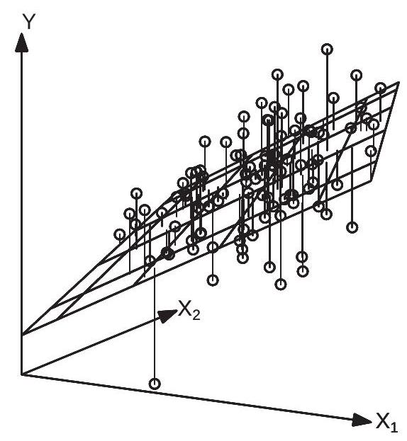 To illustrate, Figure \(3.2\) displays a scatter plot of 100 triples \(\left(Y_{i}, X_{1 i}, X_{2 i}\right)\). The regression function \(x^{\prime} \beta=x_{1} \beta_{1}+x_{2} \beta_{2}\) is a 2-dimensional surface and is shown as the plane in Figure 3.2.
