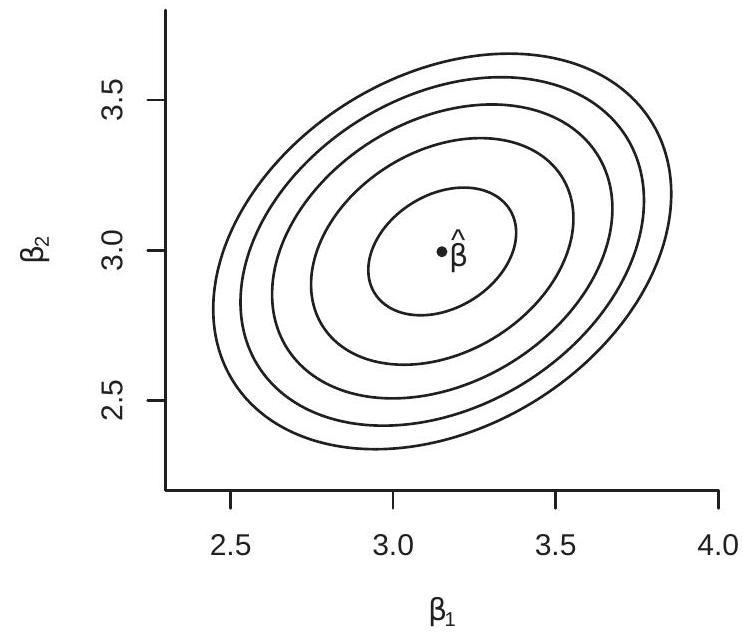 As in the single regressor case this is a quadratic function in \(\beta\). The difference is that in the multiple regressor case this is a vector-valued quadratic function. To visualize the sum of squared errors function Figure 3.3(a) displays \(\operatorname{SSE}(\beta)\). Another way to visualize a 3-dimensional surface is by a contour plot. A contour plot of the same \(\operatorname{SSE}(\beta)\) function is shown in Figure 3.3(b). The contour lines are points in the \(\left(\beta_{1}, \beta_{2}\right)\) space where \(\operatorname{SSE}(\beta)\) takes the same value. The contour lines are elliptical because \(\operatorname{SSE}(\beta)\) is quadratic.