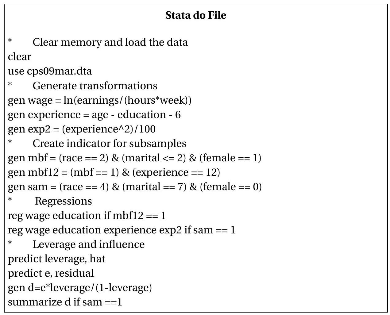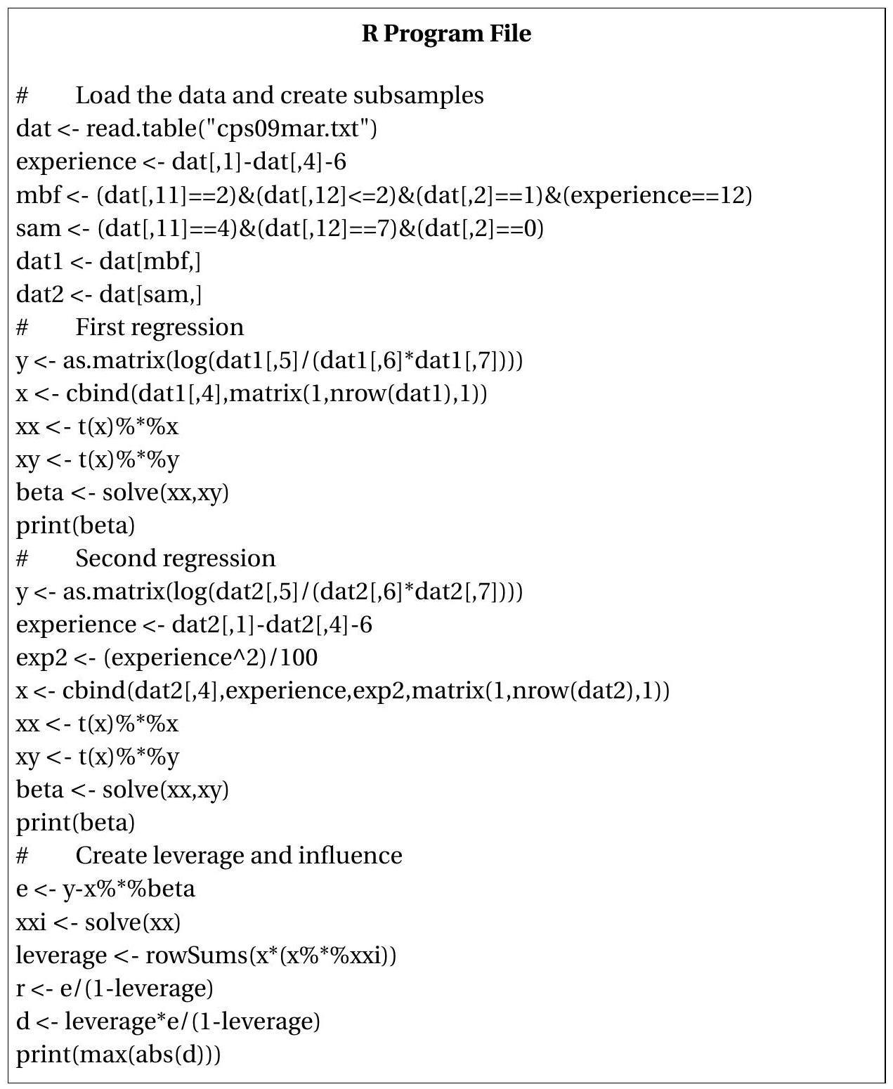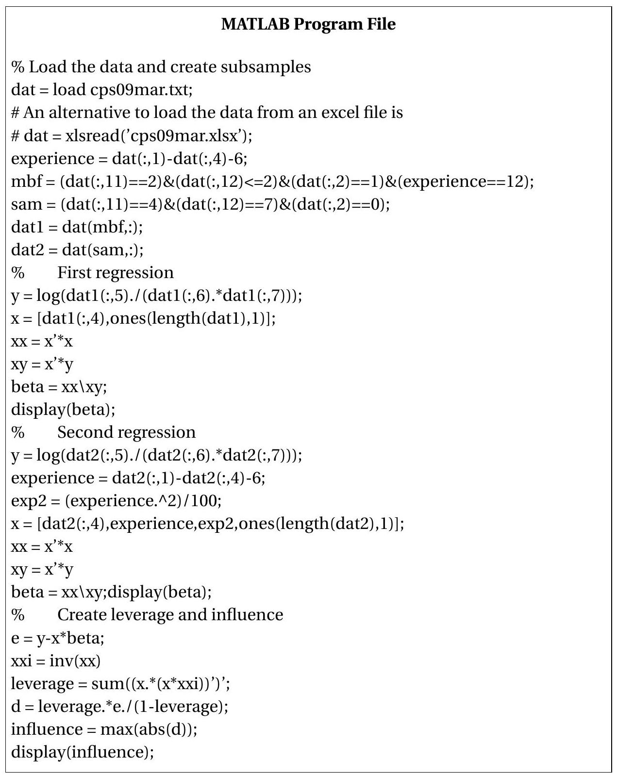 We now illustrate programming files for Stata, R, and MATLAB, which execute a portion of the empirical illustrations from Sections \(3.7\) and 3.21. For the R and MATLAB code we illustrate using explicit matrix operations. Alternatively, R and MATLAB have built-in functions which implement least squares regression without the need for explicit matrix operations. In \(\mathrm{R}\) the standard function is \(1 \mathrm{~m}\). In MATLAB the standard function is regress. The advantage of using explicit matrix operations as shown below is that you know exactly what computations are done and it is easier to go “out of the box” to execute new procedures. The advantage of using built-in functions is that coding is simplified and you are much less likely to make a coding error.