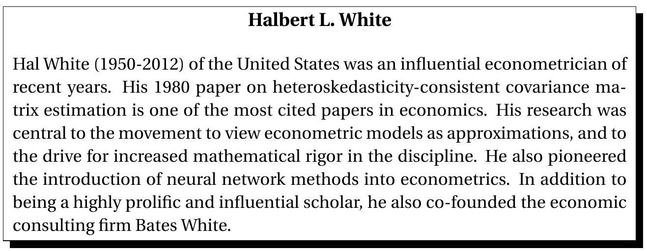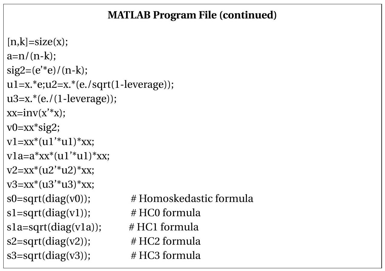 In the special case of the linear homoskedastic regression model, \(\boldsymbol{D}=\boldsymbol{I}_{n} \sigma^{2}\), so \(\boldsymbol{X}^{\prime} \boldsymbol{D} \boldsymbol{X}=\boldsymbol{X}^{\prime} \boldsymbol{X} \sigma^{2}\), and the covariance matrix simplifies to \(\boldsymbol{V}_{\widehat{\beta}}=\left(\boldsymbol{X}^{\prime} \boldsymbol{X}\right)^{-1} \sigma^{2}\).