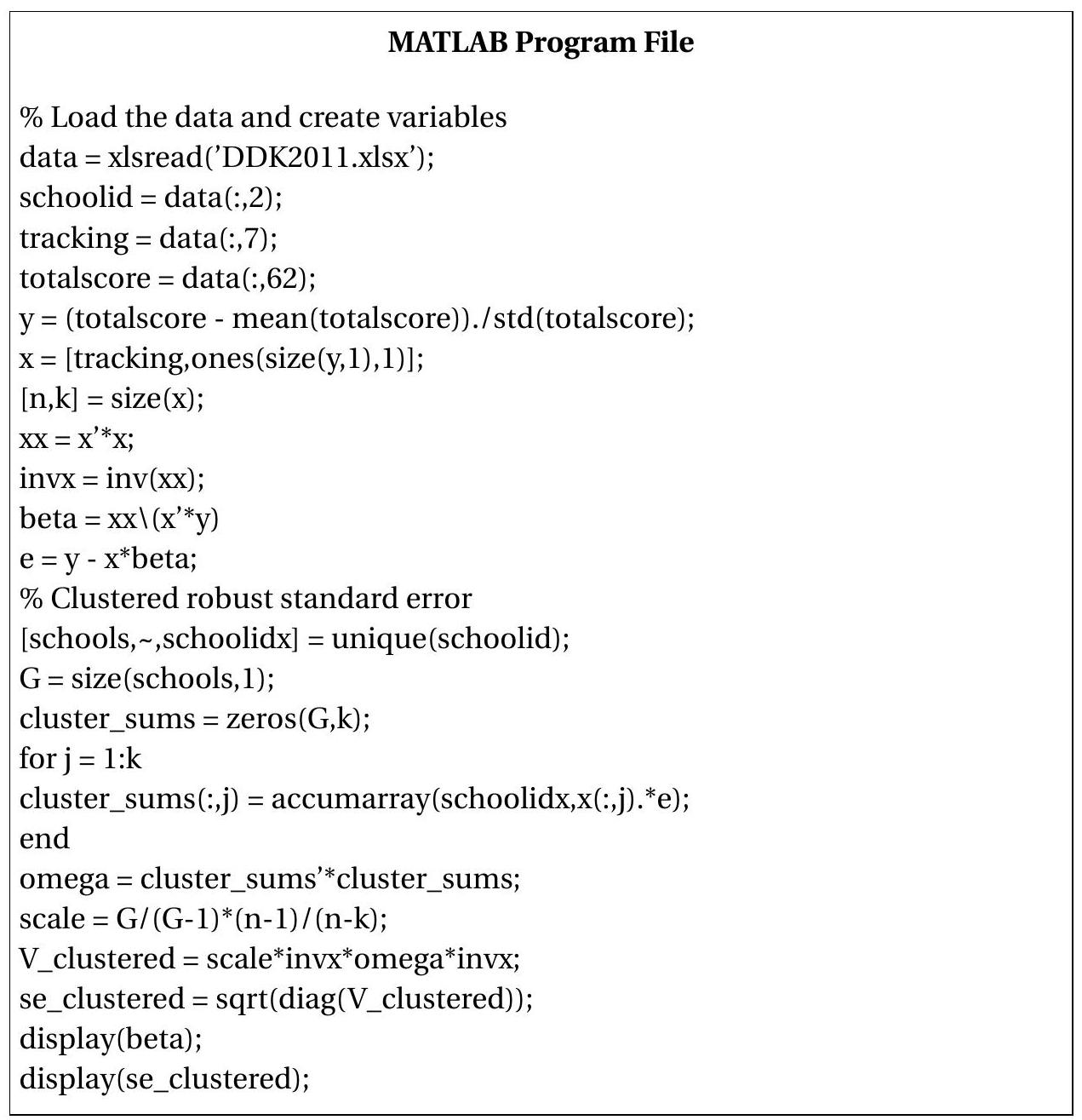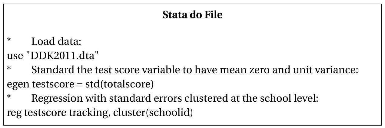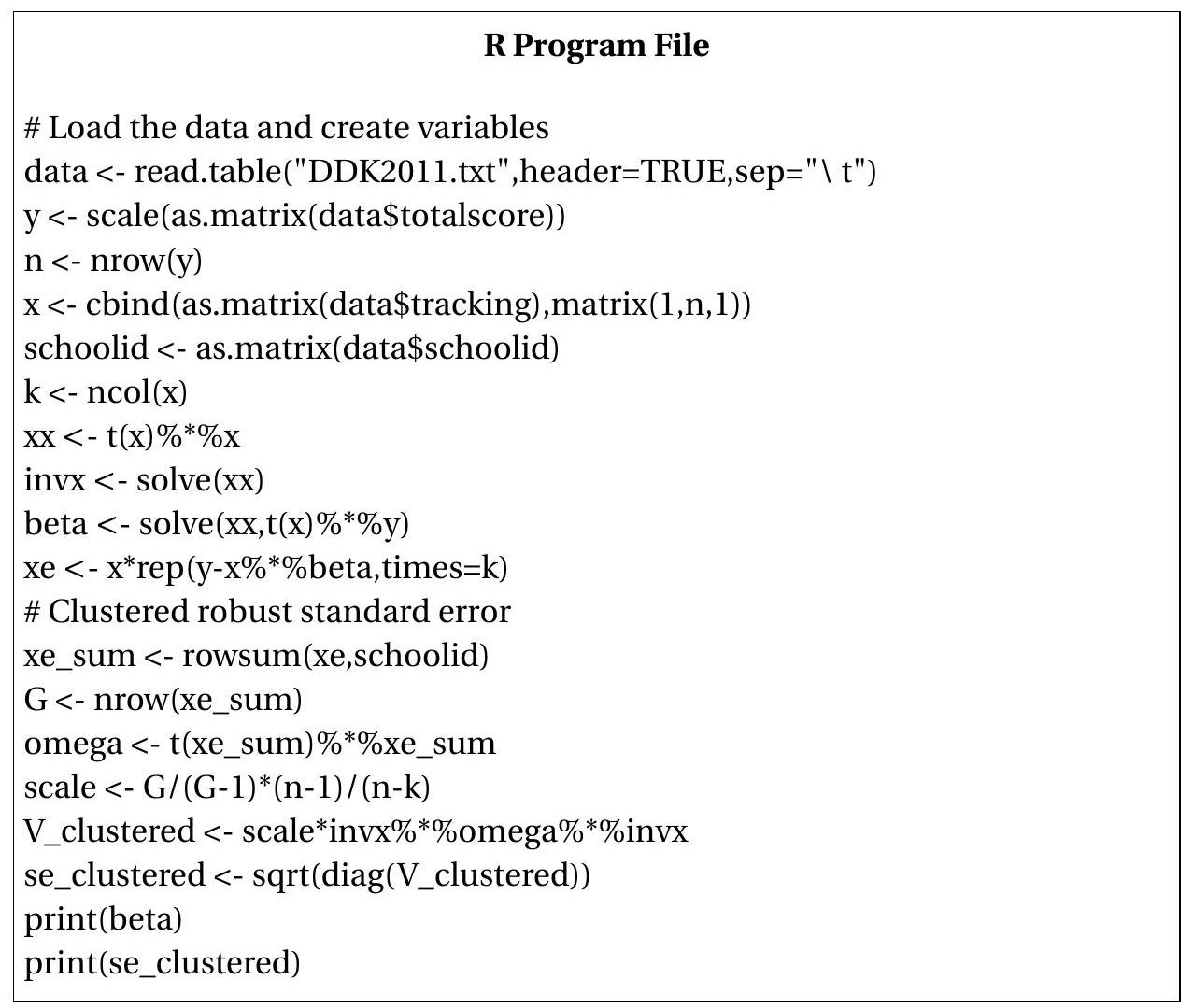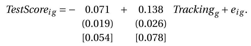 Exercise 4.26 Extend the empirical analysis reported in Section \(4.21\) using the DDK2011 dataset on the textbook website.. Do a regression of standardized test score (totalscore normalized to have zero mean and variance 1) on tracking, age, gender, being assigned to the contract teacher, and student’s percentile in the initial distribution. (The sample size will be smaller as some observations have missing variables.) Calculate standard errors using both the conventional robust formula, and clustering based on the school.