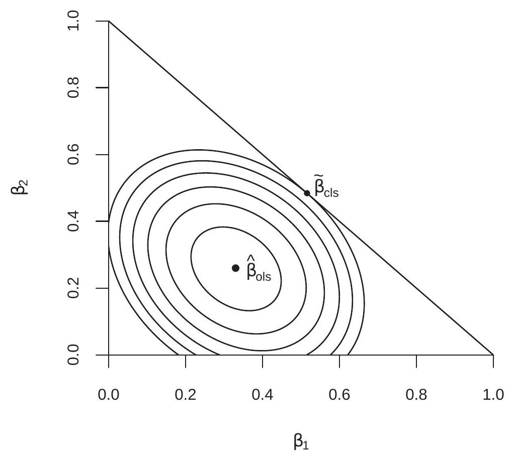 To illustrate we generated a random sample of 100 observations for the variables \(\left(Y, X_{1}, X_{2}\right)\) and calculated the sum of squared errors function for the regression of \(Y\) on \(X_{1}\) and \(X_{2}\). Figure \(8.1\) displays contour plots of the sum of squared errors function. The center of the contour plots is the least squares minimizer \(\widehat{\beta}_{\text {ols }}=(0.33,0.26)^{\prime}\). Suppose it is desired to estimate the coefficients subject to the constraint \(\beta_{1}+\beta_{2}=1\). This constraint is displayed in the figure by the straight line. The constrained least squares estimator is the point on this straight line which yields the smallest sum of squared errors. This is the point which intersects with the lowest contour plot. The solution is the point where a contour plot is tangent to the constraint line and is marked as \(\widetilde{\beta}_{\mathrm{cls}}=(0.52,0.48)^{\prime}\).