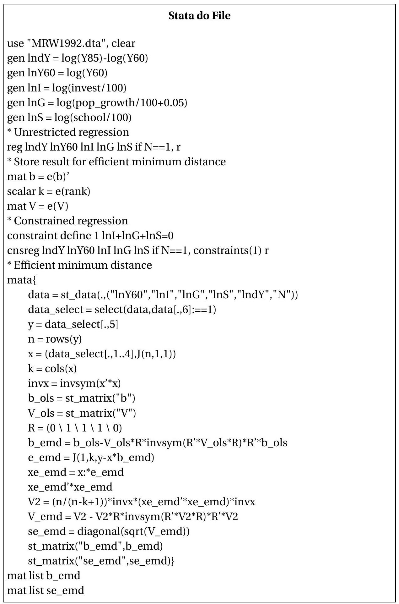 Exercise 8.18 Suppose you have two independent samples each with \(n\) observations which satisfy the models \(Y_{1}=X_{1}^{\prime} \beta_{1}+e_{1}\) with \(\mathbb{E}\left[X_{1} e_{1}\right]=0\) and \(Y_{2}=X_{2}^{\prime} \beta_{2}+e_{2}\) with \(\mathbb{E}\left[X_{2} e_{2}\right]=0\) where \(\beta_{1}\) and \(\beta_{2}\) are both \(k \times 1\). You estimate \(\beta_{1}\) and \(\beta_{2}\) by OLS on each sample, with consistent asymptotic covariance matrix estimators \(\widehat{\boldsymbol{V}}_{\beta_{1}}\) and \(\widehat{\boldsymbol{V}}_{\beta_{2}}\). Consider efficient minimum distance estimation under the restriction \(\beta_{1}=\beta_{2}\).