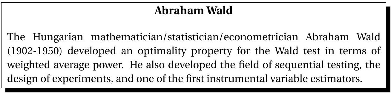 Definition 9.1 The null hypothesis \(\mathbb{M}_{0}\) is the restriction \(\theta=\theta_{0}\) or \(\beta \in B_{0}\).