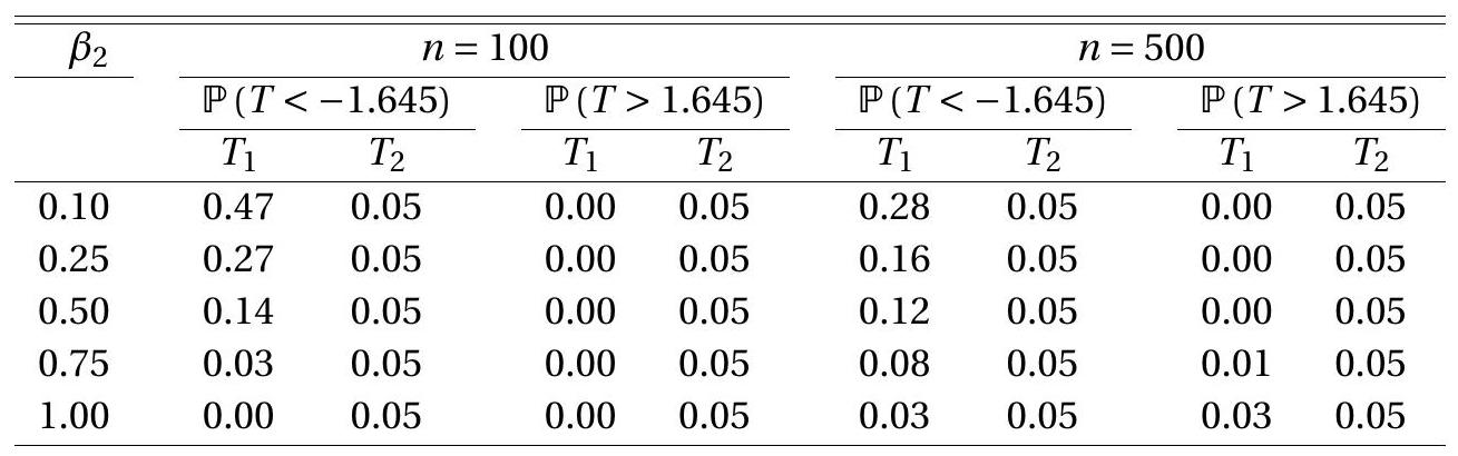 From the 1000 replications estimate \(\mathbb{P}\left[T_{\beta}>1.645\right]\) and \(\mathbb{P}\left[T_{\theta}>1.645\right]\). What does asymptotic theory predict these probabilities should be in large samples? What do your simulation results indicate?