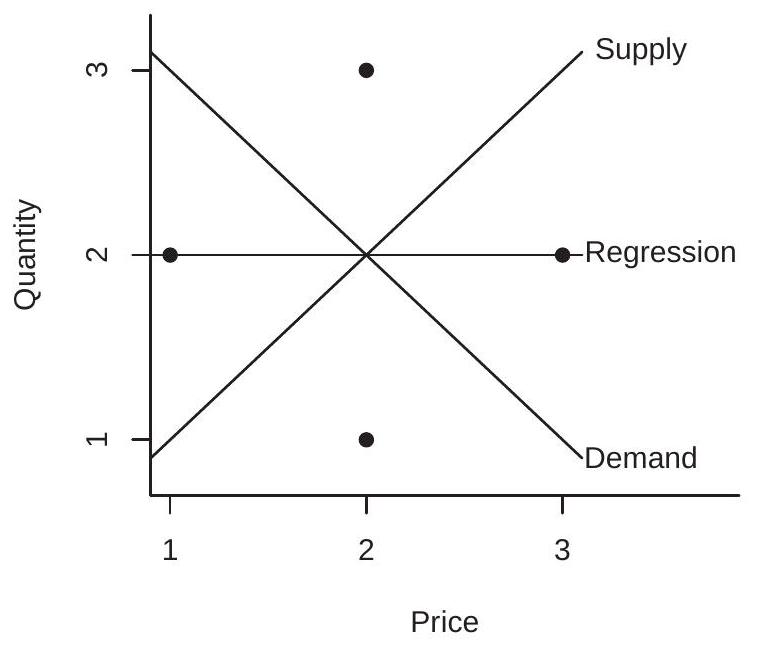 To illustrate, Figure 12.1(b) draws a supply/demand model with Quantity on the y-axis and Price on the \(\mathrm{x}\)-axis. The supply and demand equations are \(Q=P+\varepsilon_{1}\) and \(Q=4-P-\varepsilon_{2}\), respectively. Suppose that the errors each have the Rademacher distribution \(\varepsilon \in\{-1,+1\}\). This model has four equilibrium outcomes, marked by the four points in the figure. The regression line through these four points has a slope of zero and is marked as “Regression”. This is what would be measured by a least squares regression of observed quantity on observed price. This is endogeneity bias due to simultaneity.
