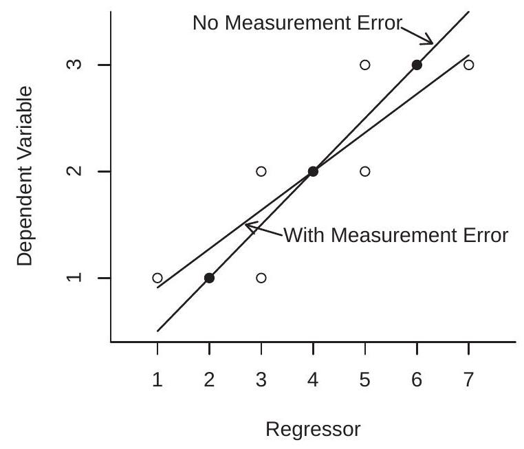 To illustrate, Figure 12.1(a) displays the impact of measurement error on the regression line. The three solid points are pairs \((Y, Z)\) which are measured without error. The regression function drawn through these three points is marked as “No Measurement Error”. The six open circles mark pairs \((Y, X)\) where \(X=Z+u\) with \(u=\{+1,-1\}\). Thus \(X\) is a mis-measured version of \(Z\). The six open circles spread the joint distribution along the \(\mathrm{x}\)-axis, but not along the \(\mathrm{y}\)-axis. The regression line drawn for these six points is marked as “With Measurement Error”. You can see that the latter regression line is flattened relative to the original regression function. This is the attenuation bias due to measurement error.