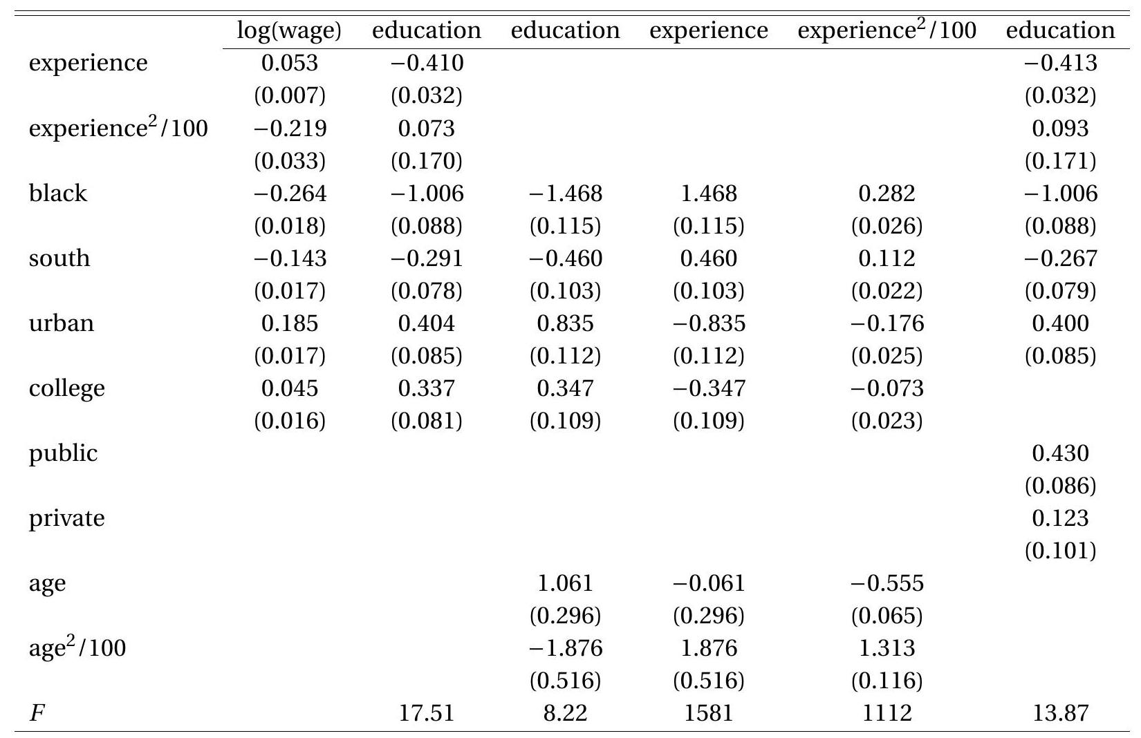 Test the hypothesis that \(e d u\) is exogenous for the structural return to schooling.