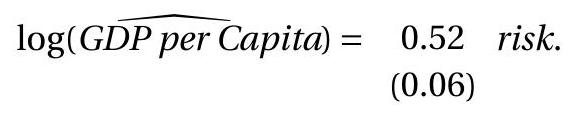 Return to our baseline model (without including latitude and africa). The authors’ reduced form equation uses \(\log\) (mortality) as the instrument, rather than, say, the level of mortality. Estimate the reduced form for risk with mortality as the instrument. (This variable is not provided in the dataset so you need to take the exponential of \(\log\) (mortality).) Can you explain why the authors preferred the equation with \(\log (\) mortality) ? (i) Try an alternative reduced form including both \(\log\) (mortality) and the square of \(\log (\) mortality). Interpret the results. Re-estimate the structural equation by 2 SLS using both \(\log (\) mortality) and its square as instruments. How do the results change?