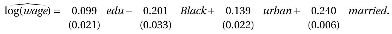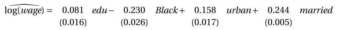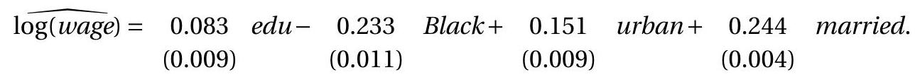 \[ \log (\text { wage })=\beta \text { education }+e \]