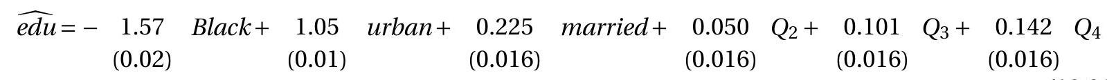Exercise 12.26 You will extend Angrist and Krueger (1991) using the data file AK1991 on the textbook website.. Their Table VIII reports estimates of an analog of (12.90) for the subsample of 26,913 Black men. Use this sub-sample for the following analysis. (a) Estimate an equation which is identical in form to (12.90) with the same additional regressors (year-of-birth, region-of-residence, and state-of-birth dummy variables) and 180 excluded instrumental variables (the interactions of quarter-of-birth times year-of-birth dummy variables and quarter-of-birth times state-of-birth interactions) but use the subsample of Black men. One regressor must be omitted to achieve identification. Which variable is this?
