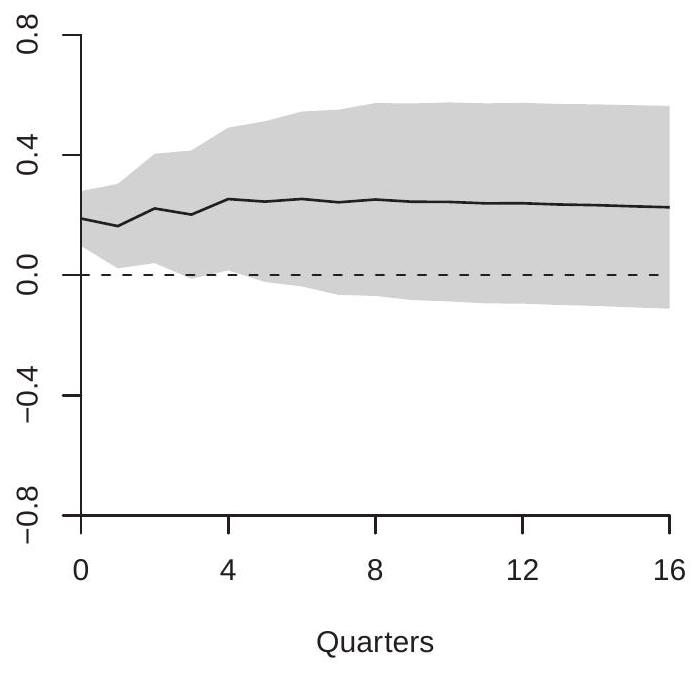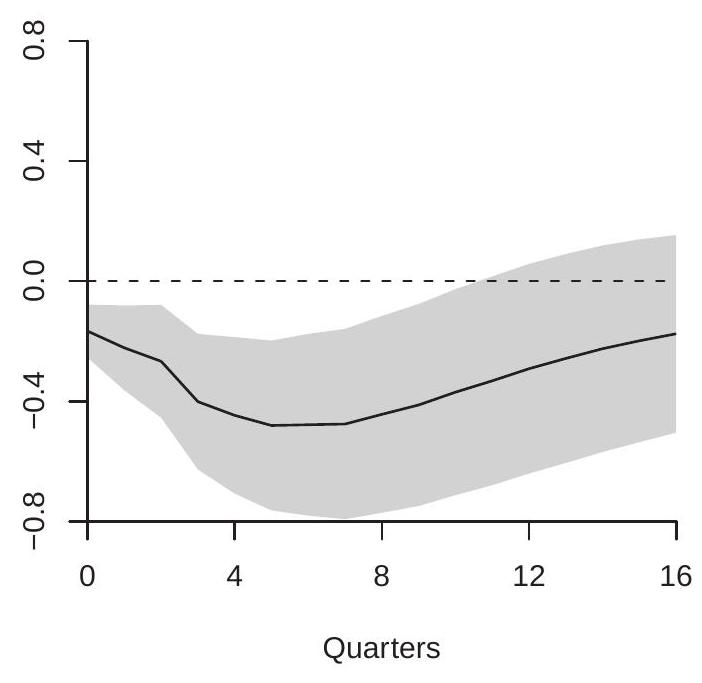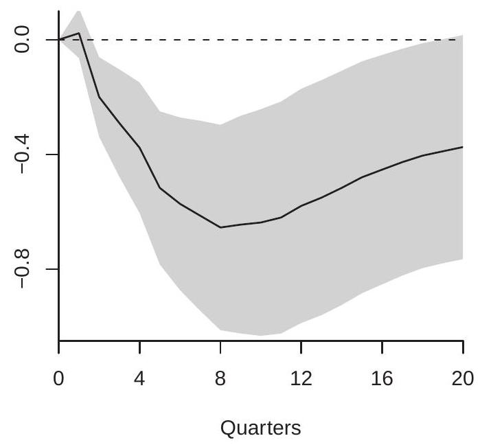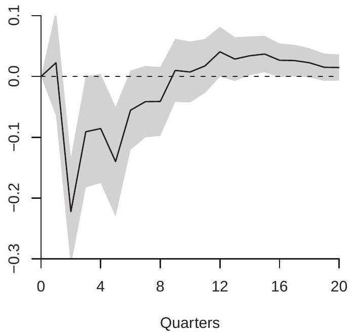 Exercise 15.17 Take the quarterly series gpdicl (Real Gross Private Domestic Investment), gdpctpi (GDP price deflator), gdpcl (real GDP), and fedfunds (Fed funds interest rate) from FRED-QD. Transform the first three into logs, e.g. \(g d p=100 \log (g d p c 1)\). Consider a structural VAR based on short-run restrictions. Use a structure of the form \(\boldsymbol{A} \boldsymbol{e}_{t}=\varepsilon_{t}\). Impose the restrictions that the first three variables do not react to the fed funds rate, that investment does not respond to prices, and that prices do not respond to investment. Finally, impose that investment is short-run unit elastic with respect to GDP (in the equation for investment, the \(\boldsymbol{A}\) coefficient on GDP is \(-1\) ).