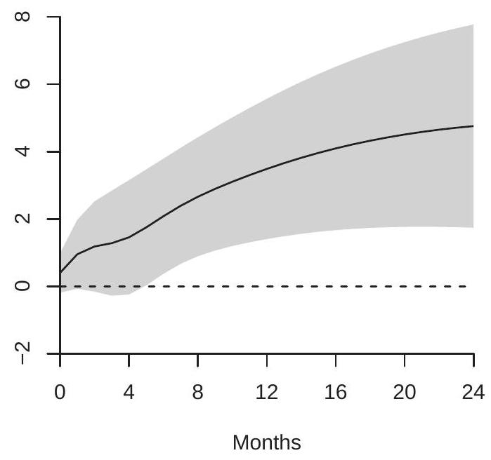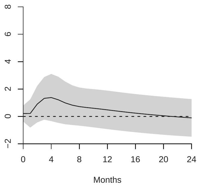 In a linear vector autoregression the impulse response function is symmetric in negative and positive innovations. That is, the impact on \(Y_{i t+h}\) of a positive innovation \(e_{j t}=1\) is \(\operatorname{IRF}_{i j}(h)\) and the impact of a negative innovation \(e_{j t}=-1\) is \(-\operatorname{IRF}_{i j}(h)\). Furthermore, the magnitude of the impact is linear in the magnitude of the innovation. Thus the impact of the innovation \(e_{j t}=2\) is \(2 \times \operatorname{IRF}_{i j}(h)\) and the impact of the innovation \(e_{j t}=-2\) is \(-2 \times \operatorname{IRF}_{i j}(h)\). This means that the shape of the impulse response function is unaffected by the magnitude of the innovation. (These are consequences of the linearity of the vector autoregressive model, not necessarily features of the true world.)