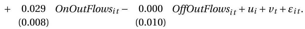 \[ \begin{aligned} & +0.005 \text { OnOutFlows }{ }_{i t}-0.005 \text { OffOutFlows }{ }_{i t}+t w_{i}+u_{i}+v_{t}+\varepsilon_{i t} \text {. } \\ & (0.005) \quad(0.005) \end{aligned} \]