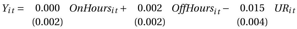 The estimated coefficient for OnHours drops to zero and becomes insignificant. The other estimates do not change meaningfully. The authors only discuss this regression in a footnote stating that adding statespecific trends “demands a great deal from the data and leaves too little variation to identify the effects of interest.” This is an unfortunate claim as actually the standard errors have decreased, not increased,