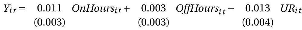 \[ Y_{i t}=\underset{(1.31)}{2.84} D_{i t}-\underset{(1.2)}{2.2} \text { Time }_{t}+\underset{(0.4)}{1.2} \text { hoursopen }_{i t}+u_{i}+\varepsilon_{i t} . \]